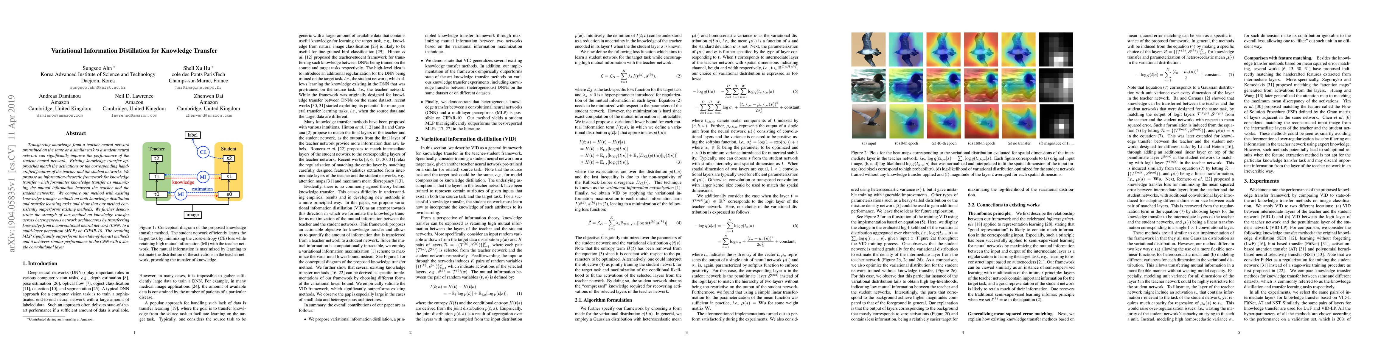 This paper introduces a variational information distillation framework for knowledge transfer between neural networks, aiming to maximize mutual information. The proposed method outperforms existing techniques in both knowledge distillation and transfer learning tasks, especially when transferring knowledge across different network architectures.