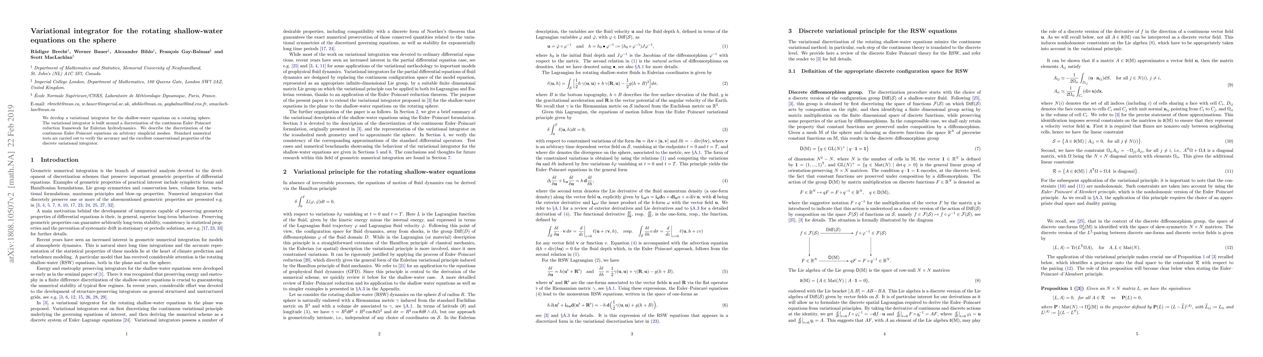 This paper develops a variational integrator for the rotating shallow-water equations on a sphere, utilizing a discretized Euler-Poincaré reduction framework. Numerical tests confirm the integrator's accuracy and excellent conservation properties.
