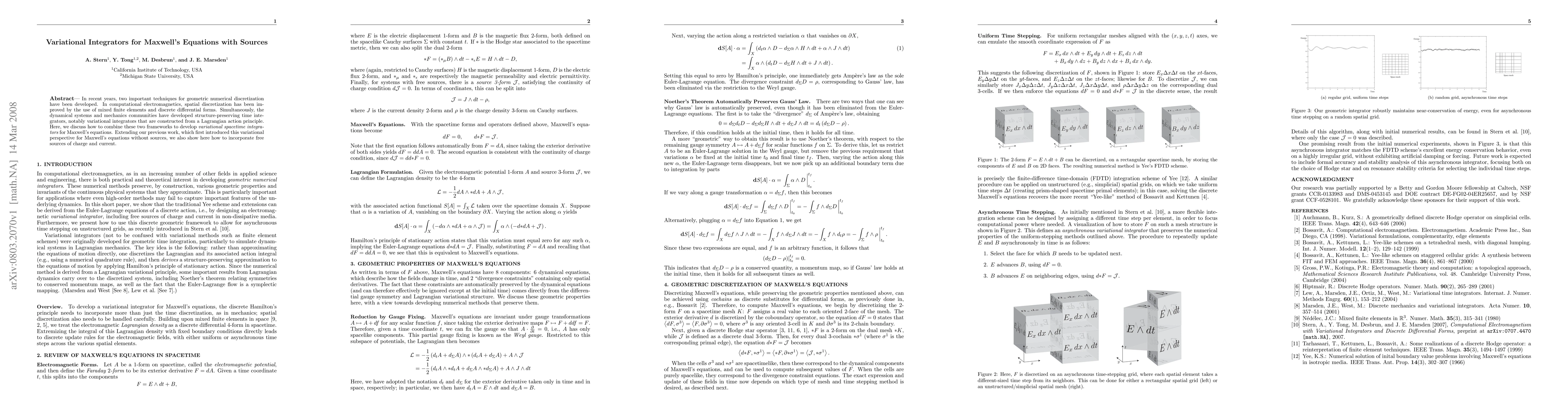 This paper combines geometric numerical discretization techniques with variational integrators to develop structure-preserving spacetime integrators for Maxwell's equations, extending previous work to include sources of charge and current. The approach leverages mixed finite elements and discrete differential forms for spatial discretization.