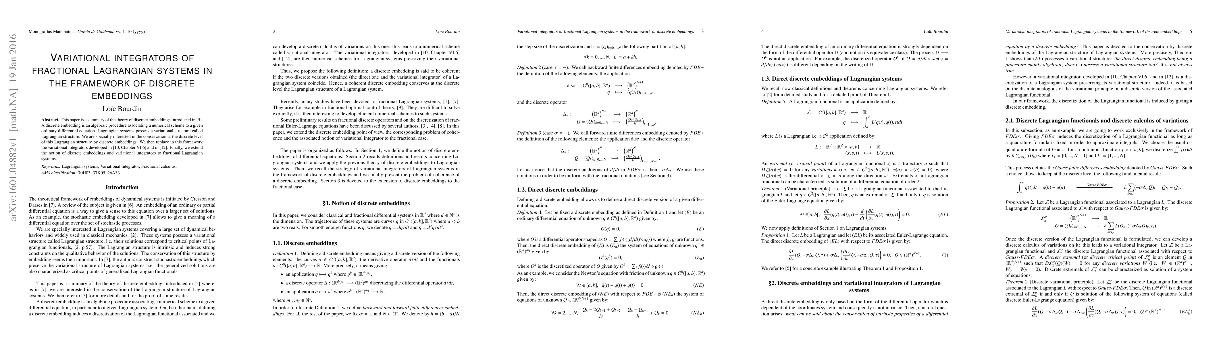 This paper is a summary of the theory of discrete embeddings introduced in [5]. A discrete embedding is an algebraic procedure associating a numerical scheme to a given ordinary differential equation. Lagrangian systems possess a variational structure called Lagrangian structure. We are specially interested in the conservation at the discrete level of this Lagrangian structure by discrete embeddings. We then replace in this framework the variational integrators developed in [10, Chapter VI.6] and in [12]. Finally, we extend the notion of discrete embeddings and variational integrators to fractional Lagrangian systems.
