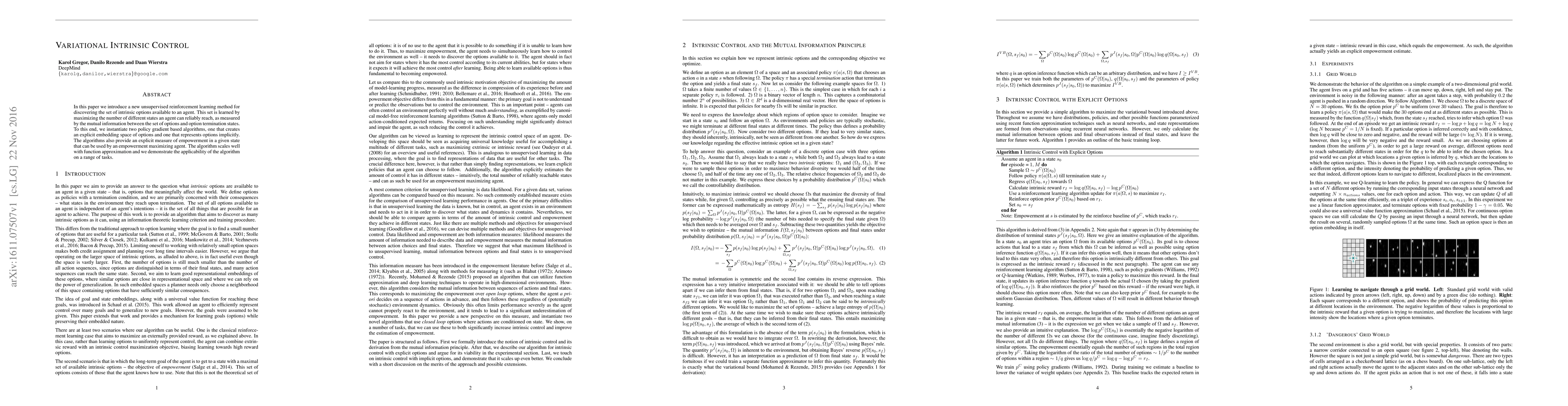 In this paper we introduce a new unsupervised reinforcement learning method for discovering the set of intrinsic options available to an agent. This set is learned by maximizing the number of different states an agent can reliably reach, as measured by the mutual information between the set of options and option termination states. To this end, we instantiate two policy gradient based algorithms, one that creates an explicit embedding space of options and one that represents options implicitly. The algorithms also provide an explicit measure of empowerment in a given state that can be used by an empowerment maximizing agent. The algorithm scales well with function approximation and we demonstrate the applicability of the algorithm on a range of tasks.