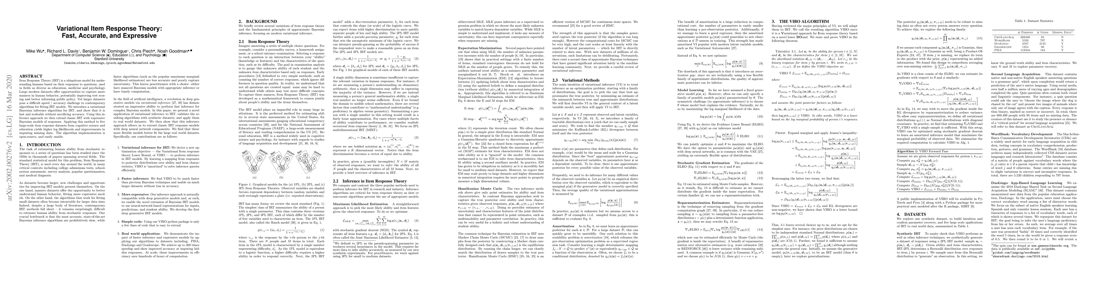 This paper introduces a variational Bayesian inference algorithm for Item Response Theory (IRT) that is both fast and scalable, addressing the speed/accuracy challenge posed by large datasets. The method improves test scoring and data imputation, and is demonstrated to perform better on large-scale datasets from cognitive science and education.