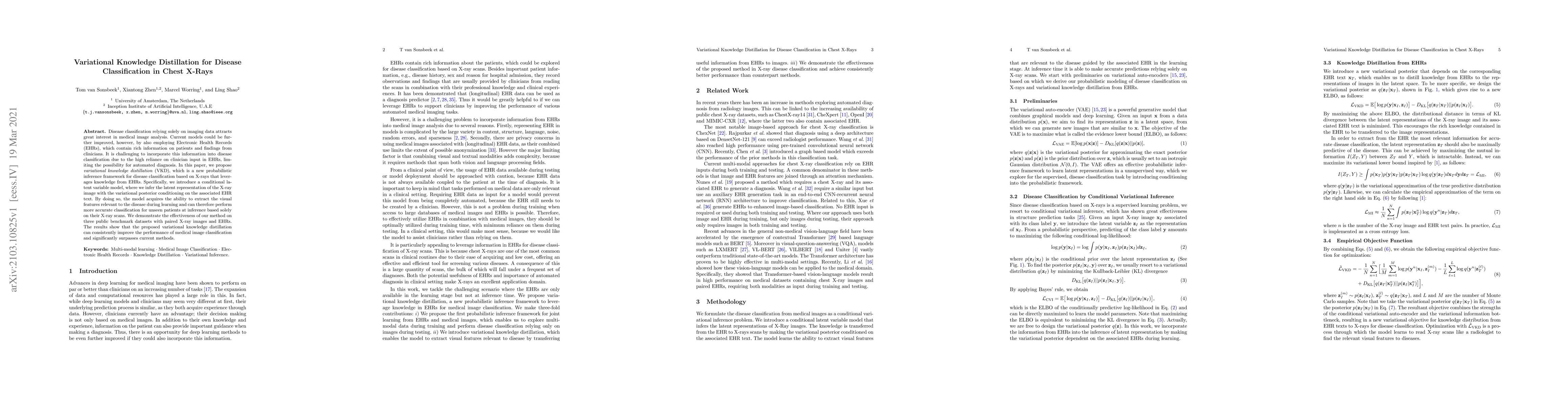 This paper proposes variational knowledge distillation (VKD) to enhance disease classification in chest X-rays by integrating Electronic Health Records (EHRs). The method uses a conditional latent variable model to infer X-ray image representations conditioned on EHR text, improving classification accuracy for unseen patients. The approach outperforms current methods on three benchmark datasets.