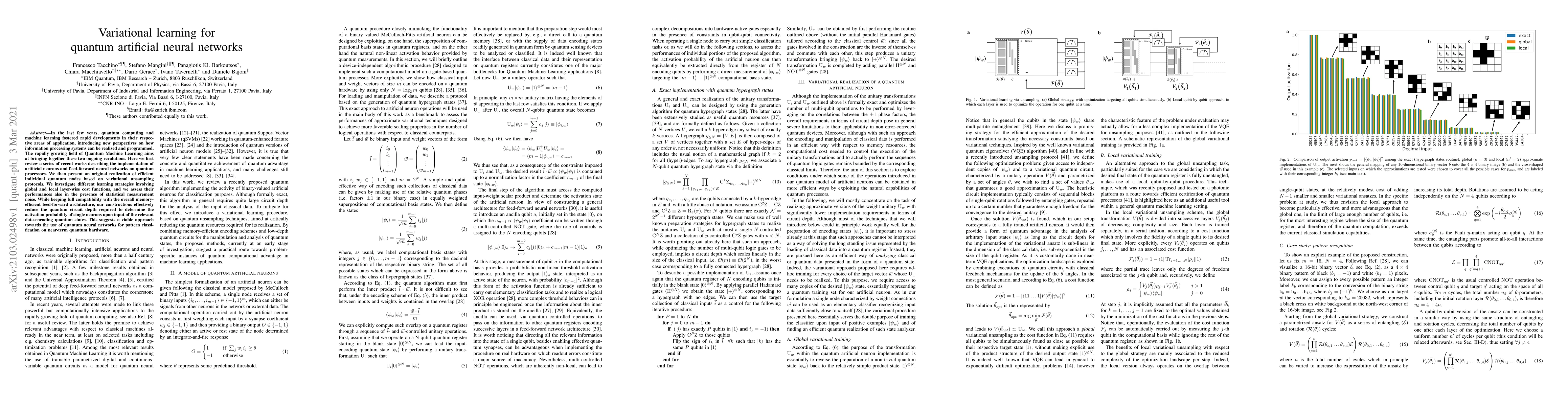 In the last few years, quantum computing and machine learning fostered rapid developments in their respective areas of application, introducing new perspectives on how information processing systems can be realized and programmed. The rapidly growing field of Quantum Machine Learning aims at bringing together these two ongoing revolutions. Here we first review a series of recent works describing the implementation of artificial neurons and feed-forward neural networks on quantum processors. We then present an original realization of efficient individual quantum nodes based on variational unsampling protocols. We investigate different learning strategies involving global and local layer-wise cost functions, and we assess their performances also in the presence of statistical measurement noise. While keeping full compatibility with the overall memory-efficient feed-forward architecture, our constructions effectively reduce the quantum circuit depth required to determine the activation probability of single neurons upon input of the relevant data-encoding quantum states. This suggests a viable approach towards the use of quantum neural networks for pattern classification on near-term quantum hardware.