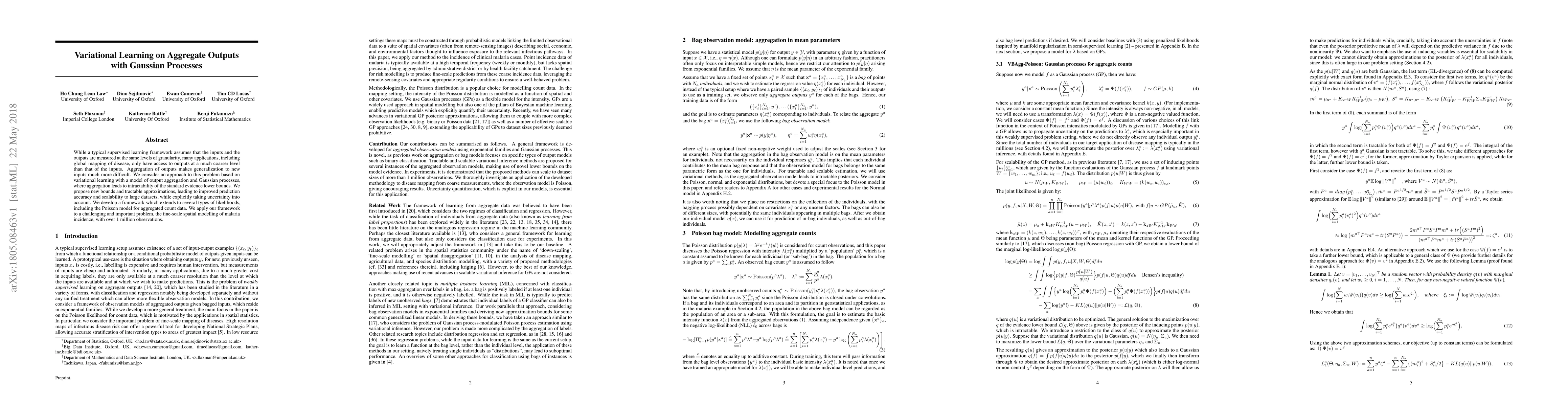 While a typical supervised learning framework assumes that the inputs and the outputs are measured at the same levels of granularity, many applications, including global mapping of disease, only have access to outputs at a much coarser level than that of the inputs. Aggregation of outputs makes generalization to new inputs much more difficult. We consider an approach to this problem based on variational learning with a model of output aggregation and Gaussian processes, where aggregation leads to intractability of the standard evidence lower bounds. We propose new bounds and tractable approximations, leading to improved prediction accuracy and scalability to large datasets, while explicitly taking uncertainty into account. We develop a framework which extends to several types of likelihoods, including the Poisson model for aggregated count data. We apply our framework to a challenging and important problem, the fine-scale spatial modelling of malaria incidence, with over 1 million observations.