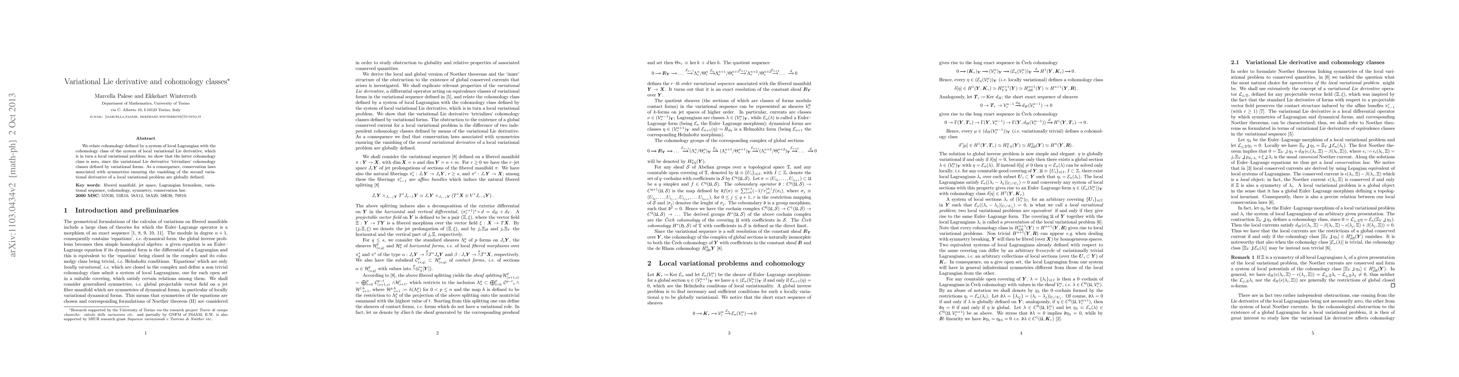 This paper establishes a connection between cohomology defined by local Lagrangian systems and the cohomology class of local variational Lie derivatives, demonstrating that the latter is trivial, leading to globally defined conservation laws tied to symmetries that nullify the second variational derivative.