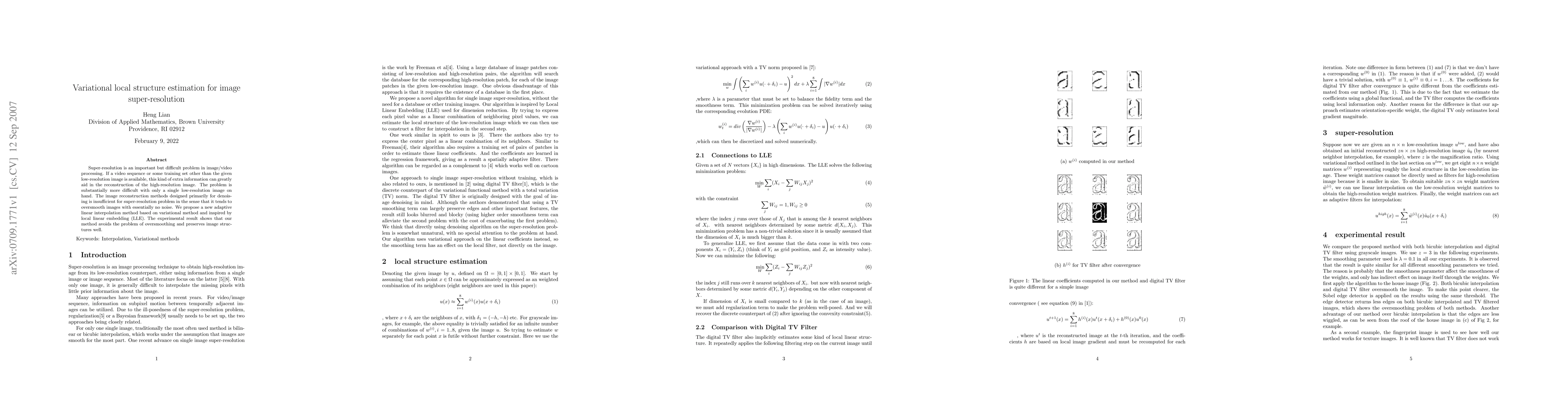 This paper proposes a variational local structure estimation method for image super-resolution, addressing the challenge of reconstructing high-resolution images from a single low-resolution input. The new adaptive linear interpolation method, inspired by local linear embedding, effectively avoids oversmoothing and better preserves image structures compared to traditional denoising-based methods.