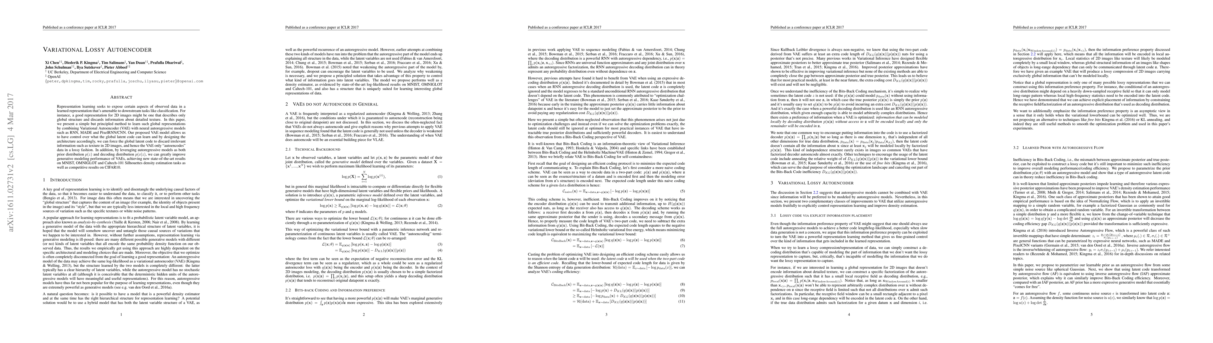 Representation learning seeks to expose certain aspects of observed data in a learned representation that's amenable to downstream tasks like classification. For instance, a good representation for 2D images might be one that describes only global structure and discards information about detailed texture. In this paper, we present a simple but principled method to learn such global representations by combining Variational Autoencoder (VAE) with neural autoregressive models such as RNN, MADE and PixelRNN/CNN. Our proposed VAE model allows us to have control over what the global latent code can learn and , by designing the architecture accordingly, we can force the global latent code to discard irrelevant information such as texture in 2D images, and hence the VAE only "autoencodes" data in a lossy fashion. In addition, by leveraging autoregressive models as both prior distribution $p(z)$ and decoding distribution $p(x|z)$, we can greatly improve generative modeling performance of VAEs, achieving new state-of-the-art results on MNIST, OMNIGLOT and Caltech-101 Silhouettes density estimation tasks.