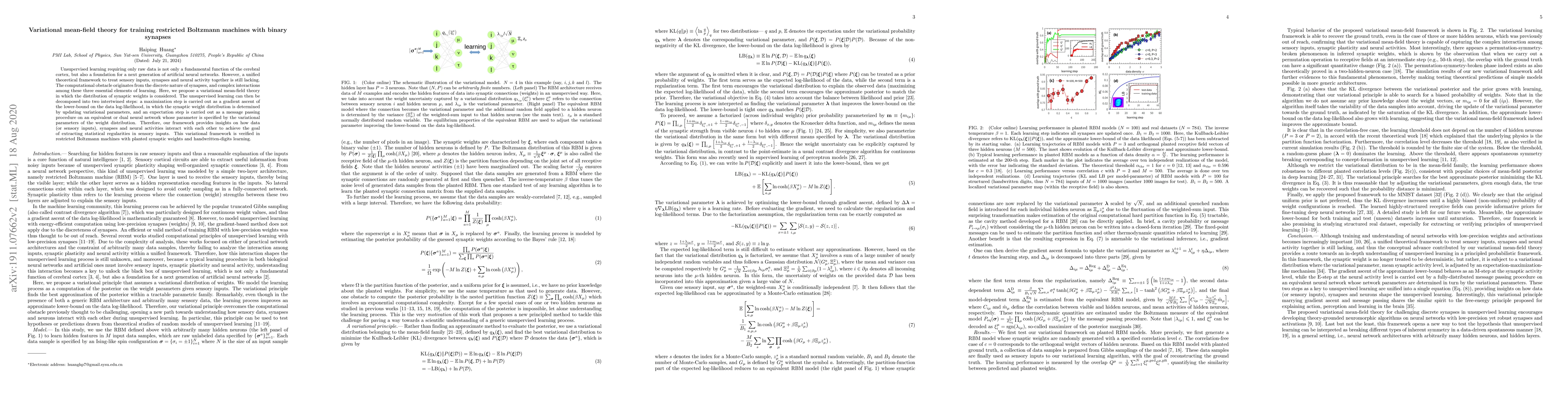 This paper proposes a variational mean-field theory to address the computational challenges of unsupervised learning in neural networks with binary synapses. It introduces a two-step process involving gradient ascent and message passing to model interactions between data, synapses, and neural activity, validated through experiments with restricted Boltzmann machines.