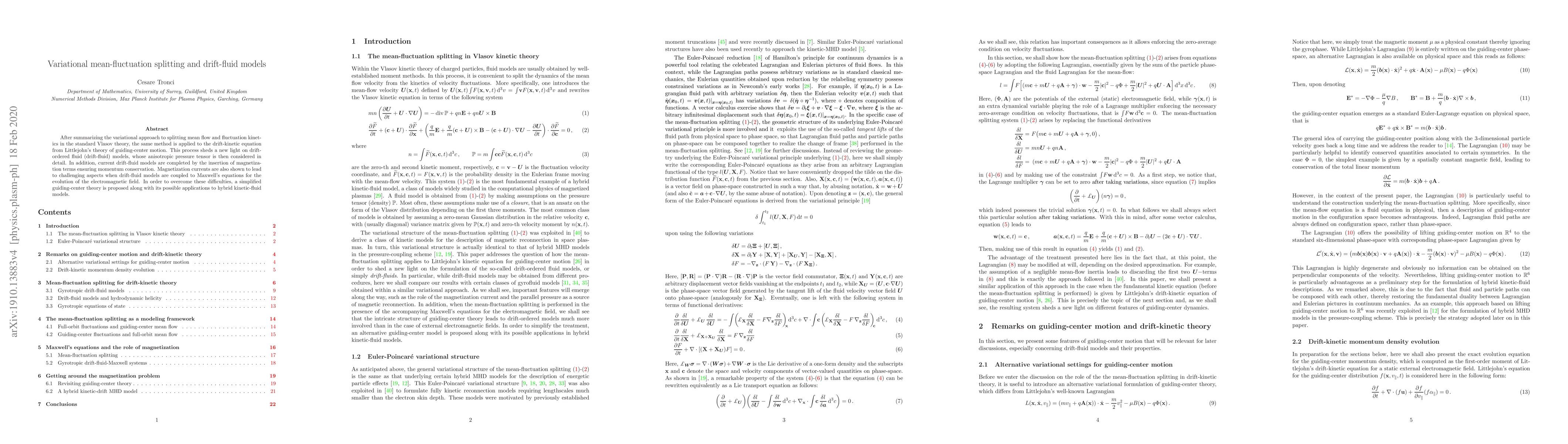 After reviewing the variational approach to splitting mean flow and fluctuation kinetics in the standard Vlasov theory, the same method is applied to the drift-kinetic equation from Littlejohn's theory of guiding-center motion. This process sheds a new light on drift-ordered fluid (drift-fluid) models, whose anisotropic pressure tensor is then considered in detail. In addition, current drift-fluid models are completed by the insertion of magnetization terms ensuring momentum conservation. Magnetization currents are also shown to lead to challenging aspects when drift-fluid models are coupled to Maxwell's equations for the evolution of the electromagnetic field. In order to overcome these difficulties, a simplified guiding-center theory is proposed along with its possible applications to hybrid kinetic-fluid models.