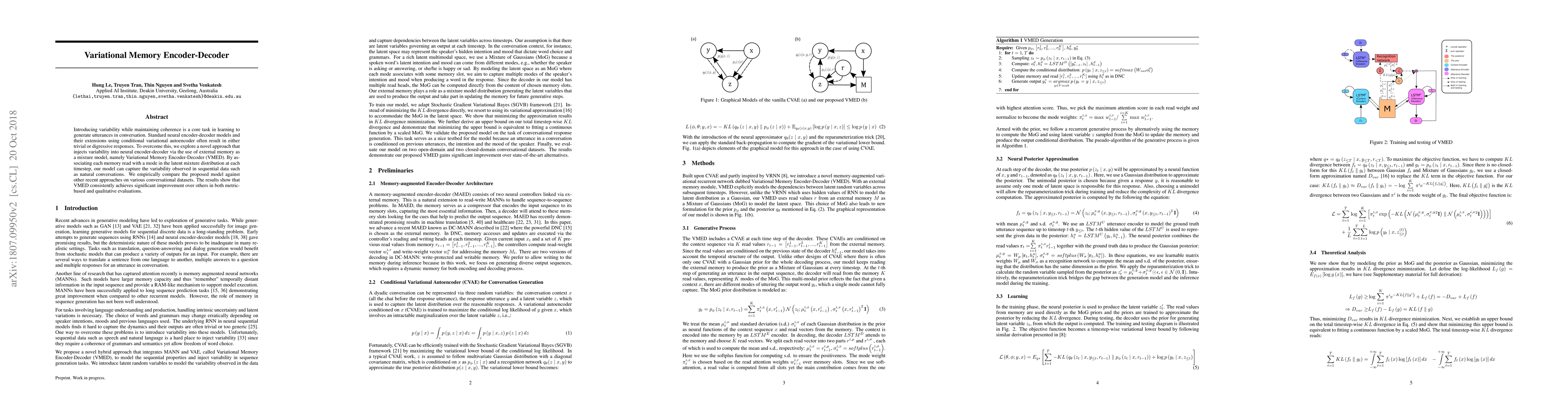 The Variational Memory Encoder-Decoder (VMED) model introduces variability into neural encoder-decoder frameworks using external memory as a mixture model, improving coherence in conversational responses. Empirical evaluations demonstrate VMED's superior performance over other approaches in both quantitative metrics and qualitative assessments.