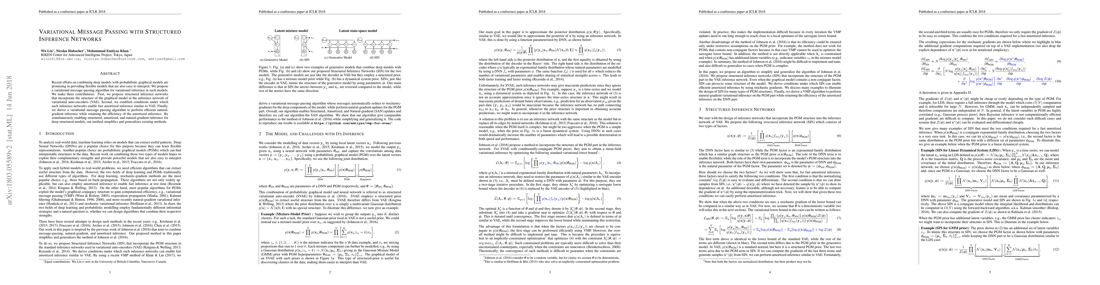 This paper proposes a variational message-passing algorithm for combining deep models with probabilistic graphical models, introducing structured inference networks that incorporate the graphical model's structure into variational auto-encoders. The method enables fast amortized inference and efficient natural-gradient inference, simplifying and generalizing existing techniques.