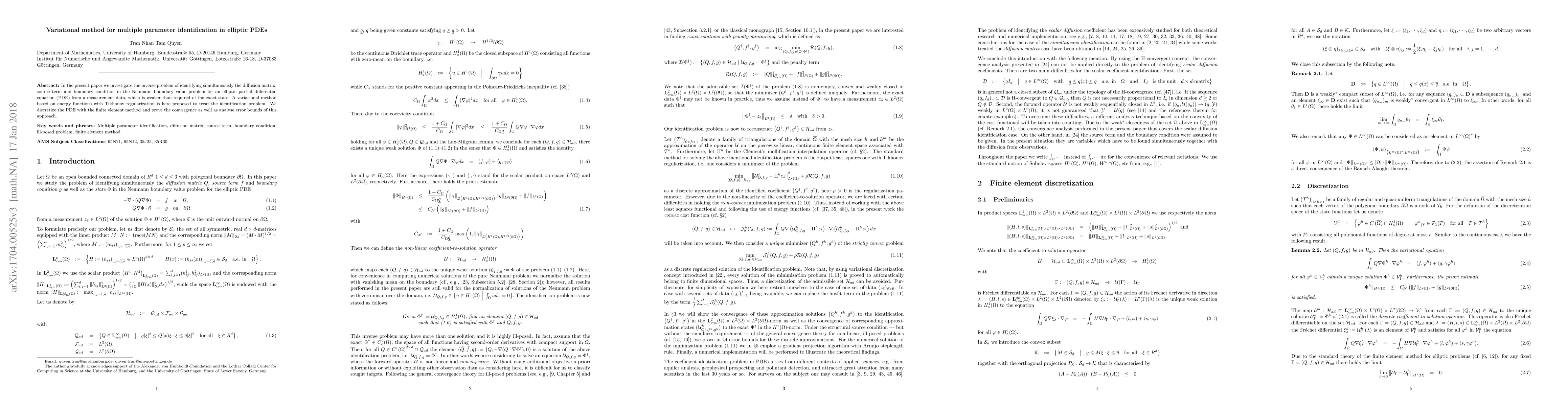 Researchers propose a variational method to identify multiple parameters in elliptic PDEs from weak measurement data, including diffusion matrix, source term, boundary condition, and state.