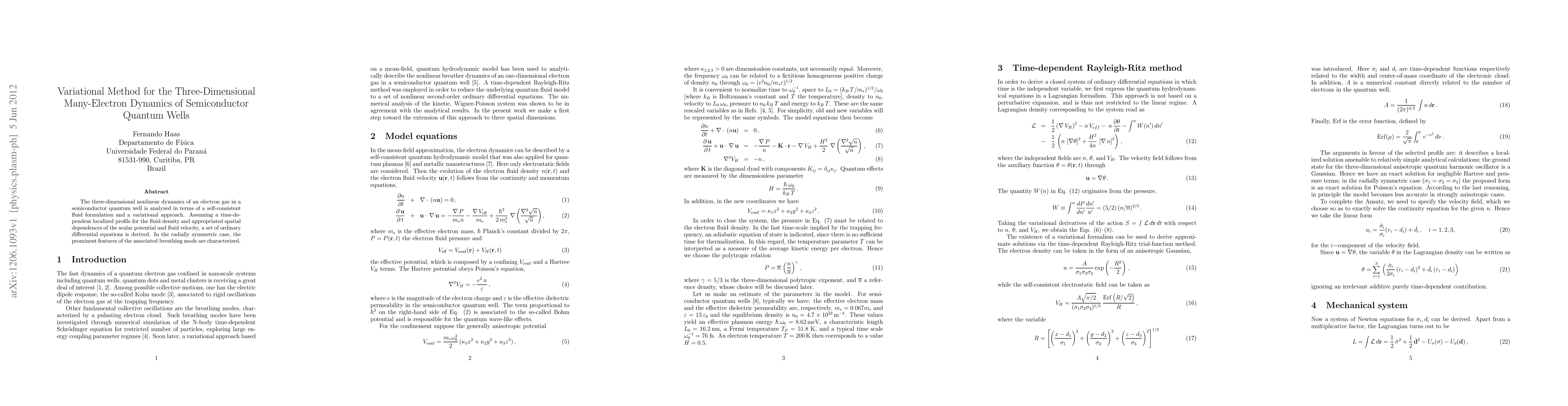 The three-dimensional nonlinear dynamics of an electron gas in a semiconductor quantum well is analyzed in terms of a self-consistent fluid formulation and a variational approach. Assuming a time-dependent localized profile for the fluid density and appropriated spatial dependences of the scalar potential and fluid velocity, a set of ordinary differential equations is derived. In the radially symmetric case, the prominent features of the associated breathing mode are characterized.
