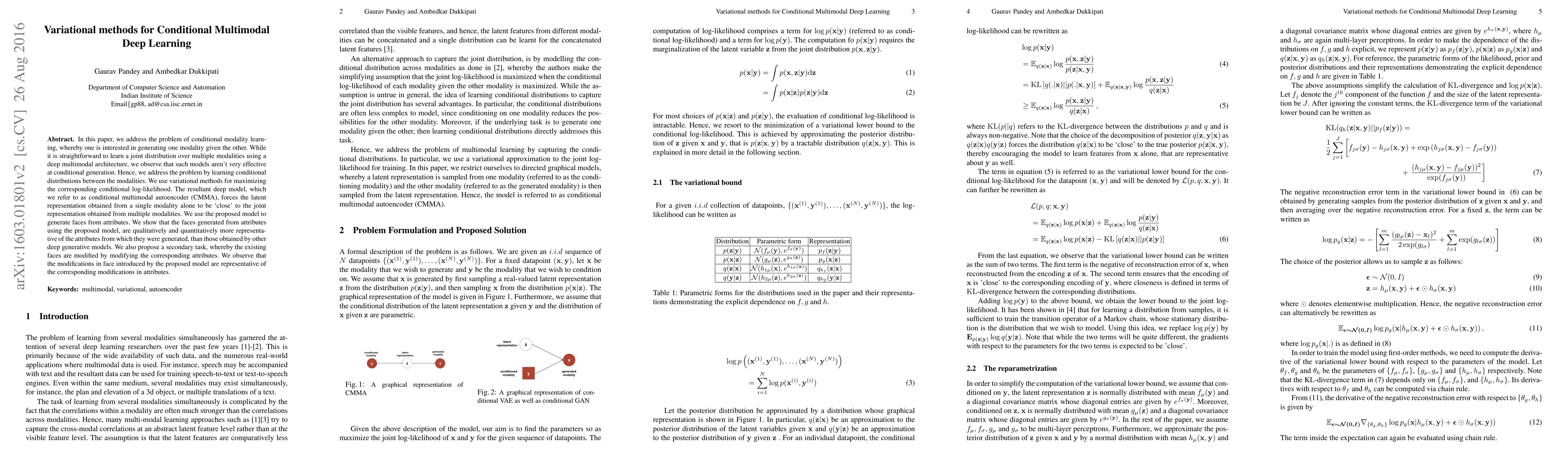 This paper proposes a conditional multimodal autoencoder (CMMA) using variational methods to generate one modality from another, achieving better representation and modification of faces based on attributes compared to other deep generative models. The CMMA model effectively learns conditional distributions and improves both qualitative and quantitative generation of faces from attributes.
