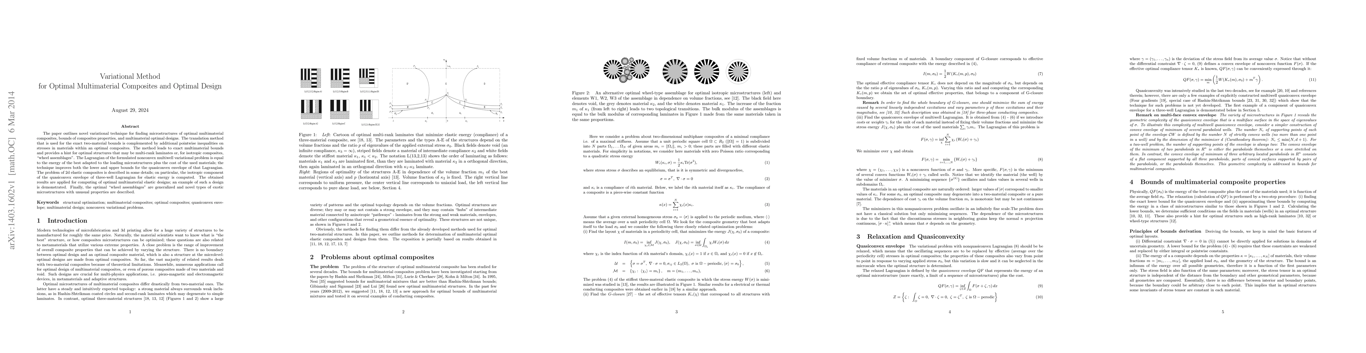 This paper introduces a novel variational technique for determining optimal microstructures in multimaterial composites, establishing exact bounds for their properties, and identifying optimal multimaterial designs. The method enhances both the lower and upper bounds of the quasiconvex envelope of the Lagrangian, leading to the discovery of optimal structures like multi-rank laminates and "wheel assemblages."