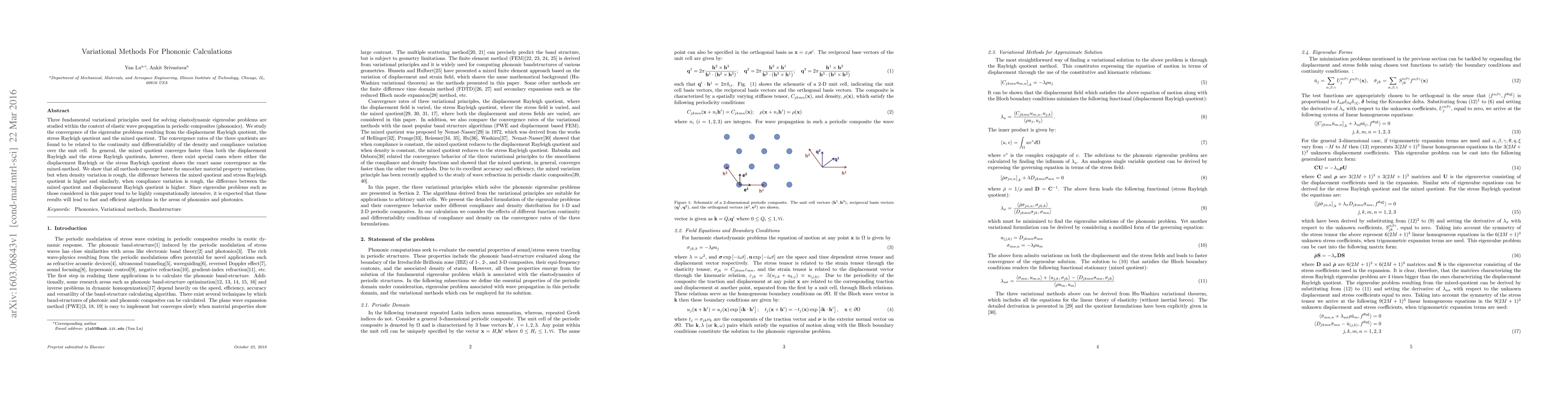 Three fundamental variational principles used for solving elastodynamic eigenvalue problems are studied within the context of elastic wave propagation in periodic composites (phononics). We study the convergence of the eigenvalue problems resulting from the displacement Rayleigh quotient, the stress Rayleigh quotient and the mixed quotient. The convergence rates of the three quotients are found to be related to the continuity and differentiability of the density and compliance variation over the unit cell. In general, the mixed quotient converges faster than both the displacement Rayleigh and the stress Rayleigh quotients, however, there exist special cases where either the displacement Rayleigh or the stress Rayleigh quotient shows the exact same convergence as the mixed-method. We show that all methods converge faster for smoother material property variations, but when density variation is rough, the difference between the mixed quotient and stress Rayleigh quotient is higher and similarly, when compliance variation is rough, the difference between the mixed quotient and displacement Rayleigh quotient is higher. Since eigenvalue problems such as those considered in this paper tend to be highly computationally intensive, it is expected that these results will lead to fast and efficient algorithms in the areas of phononics and photonics.