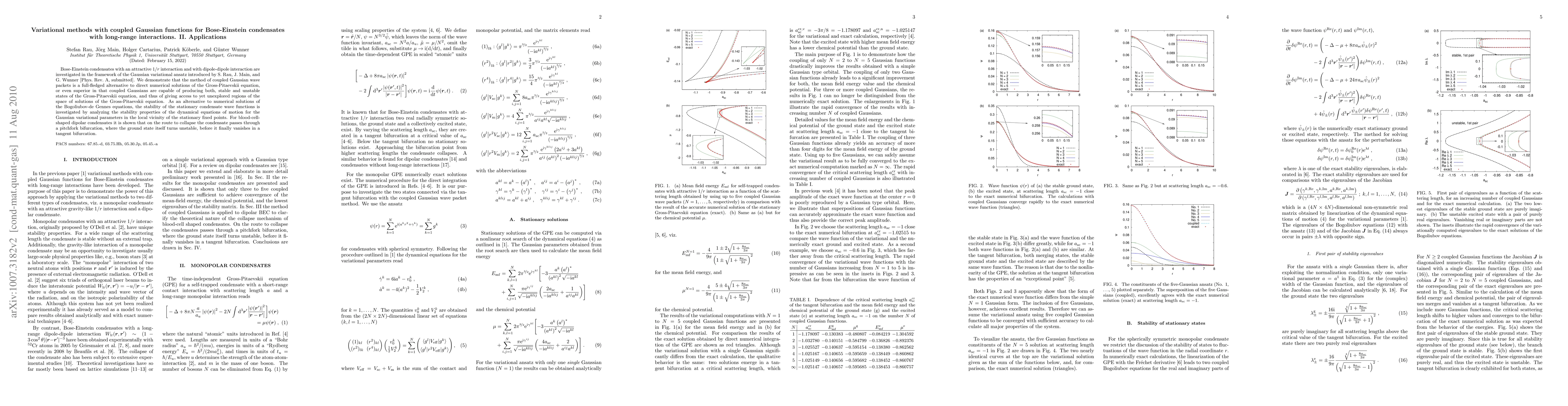 This paper applies variational methods using coupled Gaussian functions to study Bose-Einstein condensates with long-range interactions, demonstrating their effectiveness in exploring stable and unstable states compared to direct numerical solutions. It also investigates the stability of stationary condensate wave functions through the dynamical equations of motion for the Gaussian parameters.