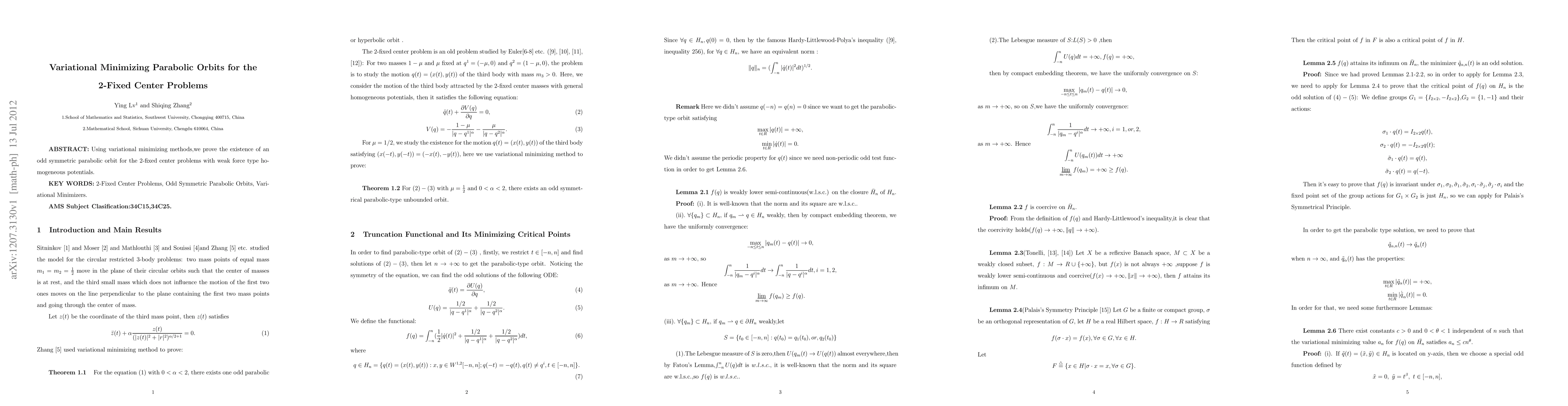 Summary: This paper proves the existence of an odd symmetric parabolic orbit for the 2-fixed center problems using variational minimizing methods, focusing on weak force type homogeneous potentials. The study highlights the application of variational techniques in celestial mechanics.