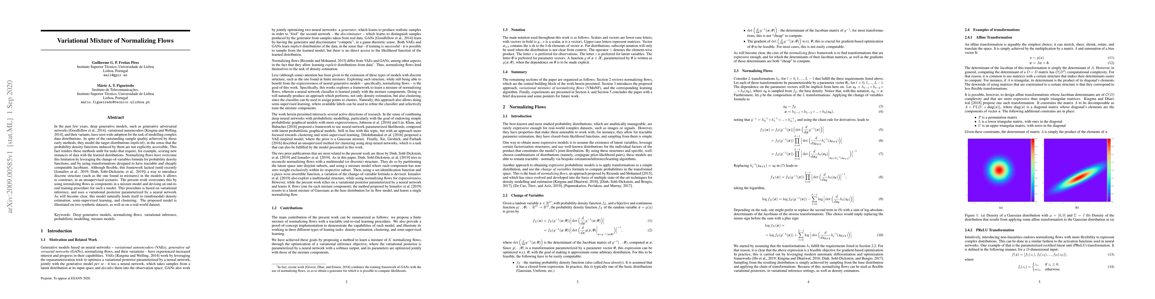 This paper proposes a variational mixture of normalizing flows to model complex data distributions explicitly, enabling tasks that require density scoring. It introduces a mixture model with normalizing flows, trained via variational inference, for multimodal density estimation, semi-supervised learning, and clustering.