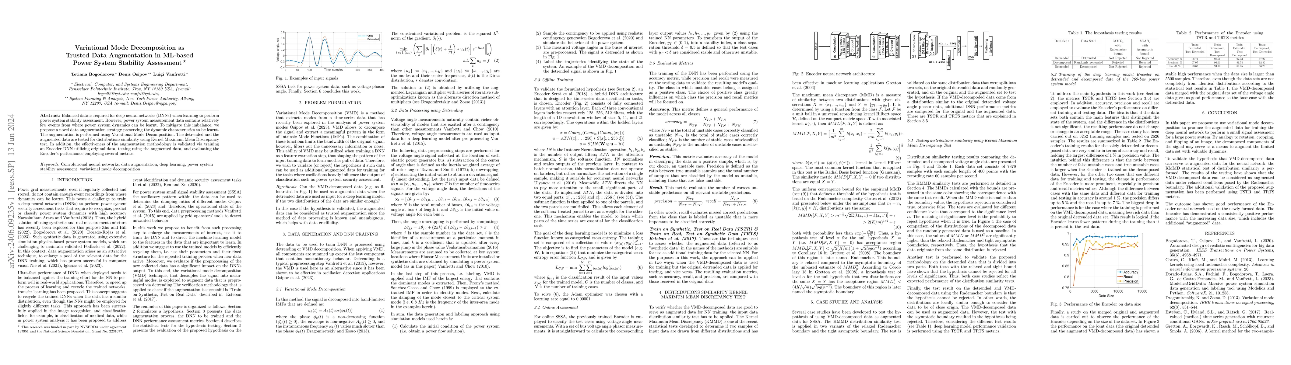 Balanced data is required for deep neural networks (DNNs) when learning to perform power system stability assessment. However, power system measurement data contains relatively few events from where power system dynamics can be learnt. To mitigate this imbalance, we propose a novel data augmentation strategy preserving the dynamic characteristics to be learnt. The augmentation is performed using Variational Mode Decomposition. The detrended and the augmented data are tested for distributions similarity using Kernel Maximum Mean Discrepancy test. In addition, the effectiveness of the augmentation methodology is validated via training an Encoder DNN utilizing original data, testing using the augmented data, and evaluating the Encoder's performance employing several metrics.