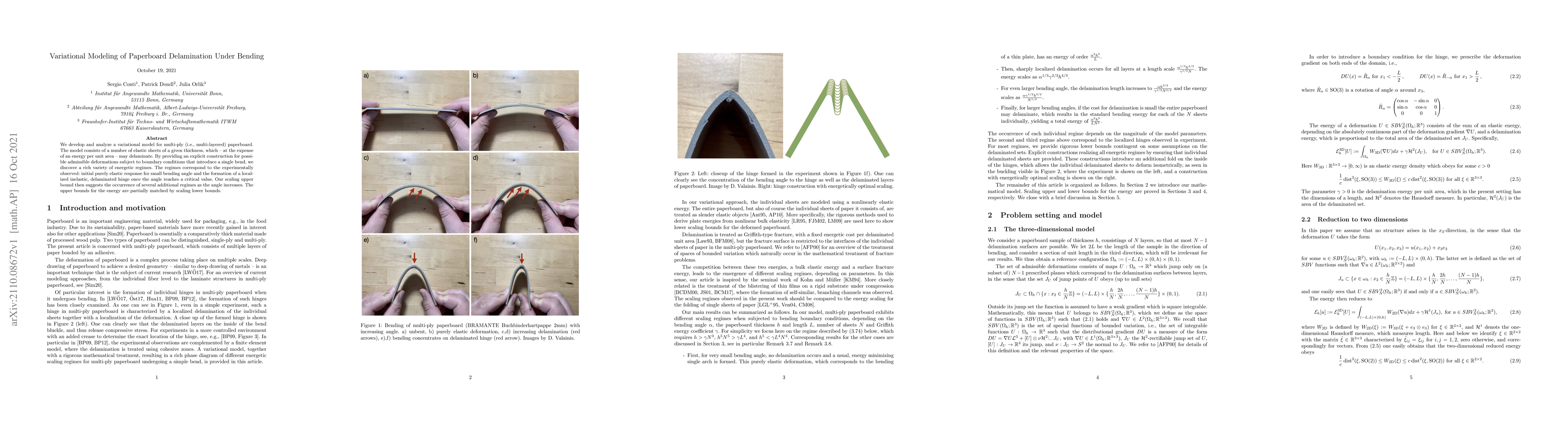 We develop and analyze a variational model for multi-ply (i.e., multi-layered) paperboard. The model consists of a number of elastic sheets of a given thickness, which -- at the expense of an energy per unit area -- may delaminate. By providing an explicit construction for possible admissible deformations subject to boundary conditions that introduce a single bend, we discover a rich variety of energetic regimes. The regimes correspond to the experimentally observed: initial purely elastic response for small bending angle and the formation of a localized inelastic, delaminated hinge once the angle reaches a critical value. Our scaling upper bound then suggests the occurrence of several additional regimes as the angle increases. The upper bounds for the energy are partially matched by scaling lower bounds.