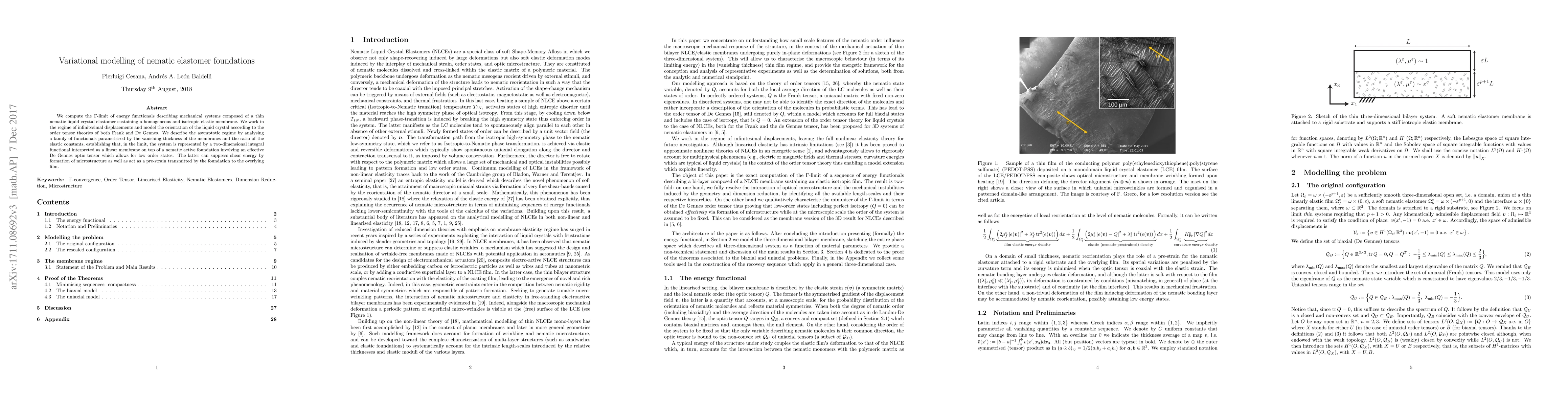 This paper computes the $\Gamma$-limit of energy functionals for thin nematic liquid crystal elastomers, revealing a two-dimensional integral functional representing a linear membrane over a nematic active foundation. The effective De Gennes optic tensor allows for low-order states, suppressing shear energy through microstructure formation.