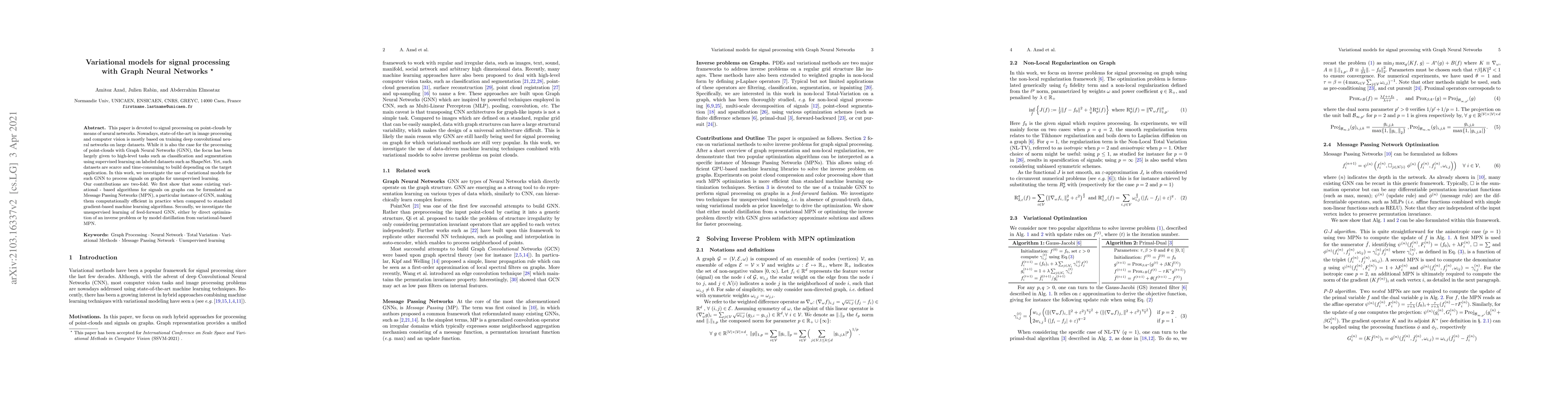 This paper explores the use of variational models and Graph Neural Networks (GNN) for unsupervised signal processing on point-clouds. It demonstrates that existing variational algorithms can be efficiently implemented as Message Passing Networks, a type of GNN, and investigates unsupervised learning techniques for GNN.