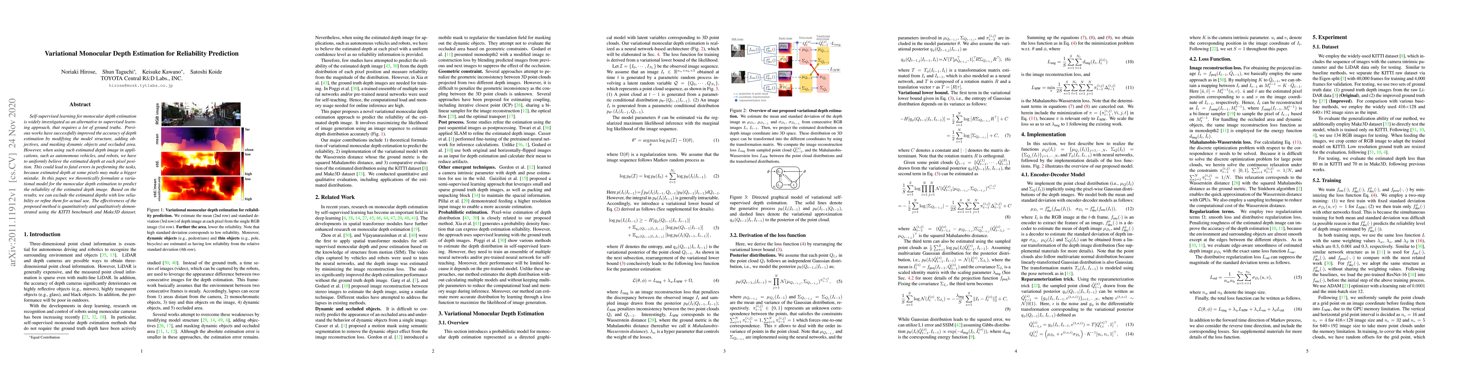 This paper proposes a variational model for self-supervised monocular depth estimation that predicts the reliability of depth predictions. The method aims to exclude unreliable depth estimates or refine them for practical applications, thereby enhancing the safety and accuracy of autonomous systems.