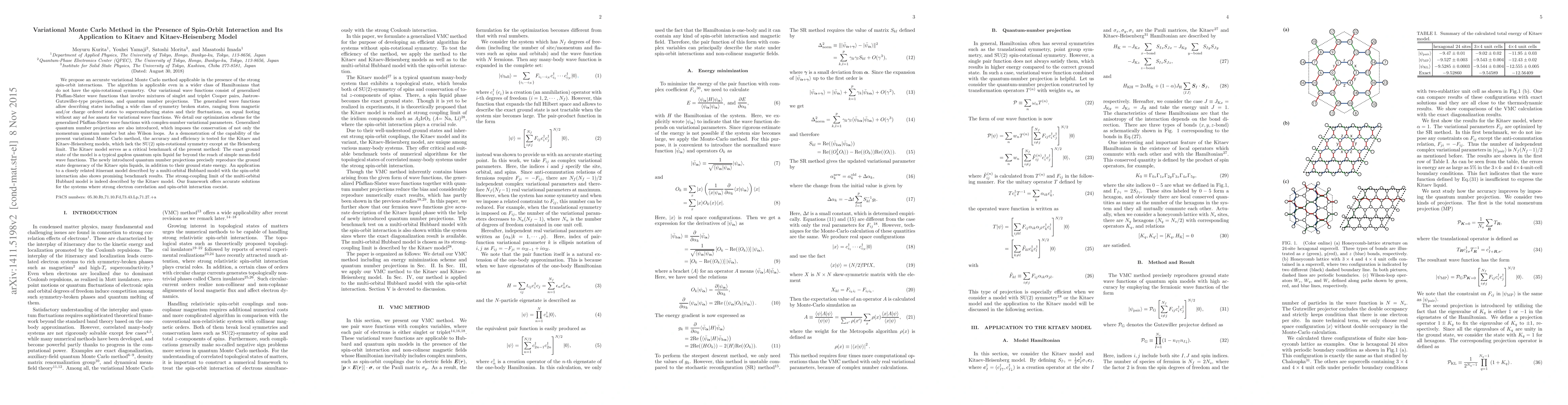 We propose an accurate variational Monte Carlo method applicable in the presence of the strong spin-orbit interaction. Our variational wave functions consist of generalized Pfaffian-Slater wave functions that involve mixtures of singlet and triplet Cooper pairs, Jastrow-Gutzwiller-type pro- jections, and quantum number projections. The generalized wave functions allow any symmetry breaking states, ranging from magnetic and/or charge ordered states to superconducting states and their fluctuations, on equal footing without any ad hoc ansatz for variational wave functions. We de- tail our optimization scheme for the generalized Pfaffian-Slater wave functions with complex-number variational parameters. Generalized quantum number projections are also introduced, which im- poses the conservation of not only spin and momentum quantum numbers but also Wilson loops. As a demonstration of the capability of the present variational Monte Carlo method, the accuracy and efficiency of the present method is tested for the Kitaev and Kitaev-Heisenberg models. The Kitaev model serves as a critical benchmark of the present method: The exact ground state of the model is a typical gapless quantum spin liquid far beyond the applicability range of simple mean-field wave functions. The newly introduced quantum number projections precisely reproduce the ground state degeneracy of the Kitaev spin liquids, in addition to their ground state energy. Our framework offers accurate solutions for the systems where strong electron correlation and spin-orbit interaction coexist.