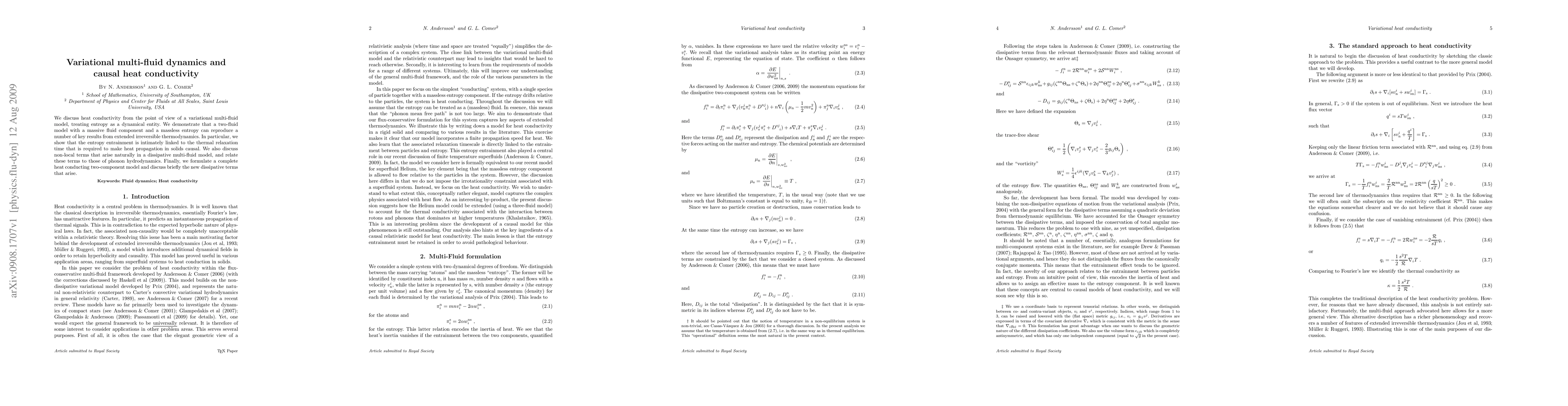 We discuss heat conductivity from the point of view of a variational multi-fluid model, treating entropy as a dynamical entity. We demonstrate that a two-fluid model with a massive fluid component and a massless entropy can reproduce a number of key results from extended irreversible thermodynamics. In particular, we show that the entropy entrainment is intimately linked to the thermal relaxation time that is required to make heat propagation in solids causal. We also discuss non-local terms that arise naturally in a dissipative multi-fluid model, and relate these terms to those of phonon hydrodynamics. Finally, we formulate a complete heat conducting two-component model and discuss briefly the new dissipative terms that arise.