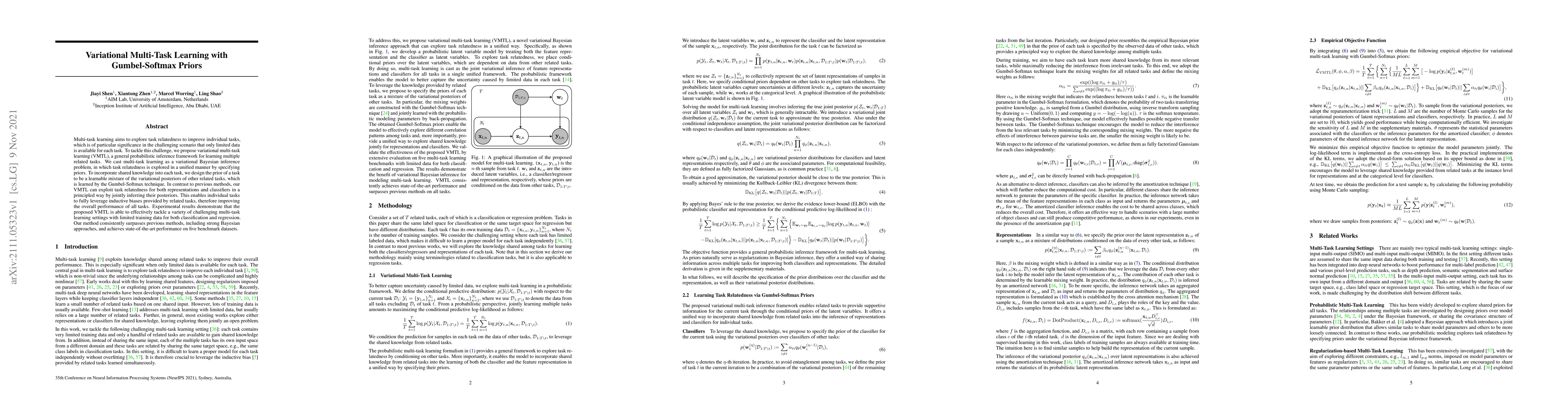 Variational Multi-Task Learning with Gumbel-Softmax Priors proposes a probabilistic framework to improve individual tasks by leveraging relatedness, outperforming previous methods on various multi-task learning settings.