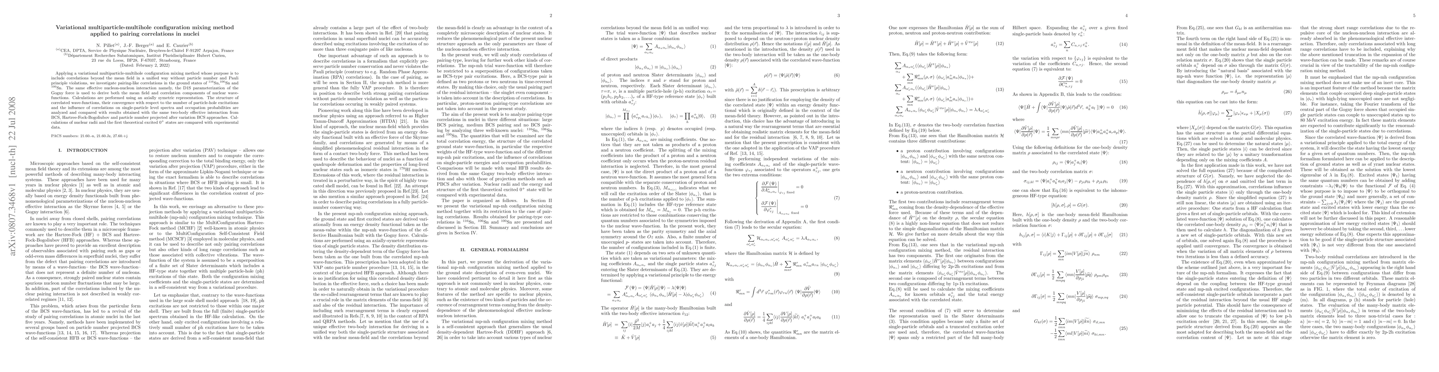 Applying a variational multiparticle-multihole configuration mixing method whose purpose is to include correlations beyond the mean field in a unified way without particle number and Pauli principle violations, we investigate pairing-like correlations in the ground states of $ ^{116}$Sn,$ ^{106}$Sn and $ ^{100}$Sn. The same effective nucleon-nucleon interaction namely, the D1S parameterization of the Gogny force is used to derive both the mean field and correlation components of nuclear wave functions. Calculations are performed using an axially symetric representation. The structure of correlated wave functions, their convergence with respect to the number of particle-hole excitations and the influence of correlations on single-particle level spectra and occupation probabilities are analyzed and compared with results obtained with the same two-body effective interaction from BCS, Hartree-Fock-Bogoliubov and particle number projected after variation BCS approaches. Calculations of nuclear radii and the first theoretical excited $0^+$ states are compared with experimental data.