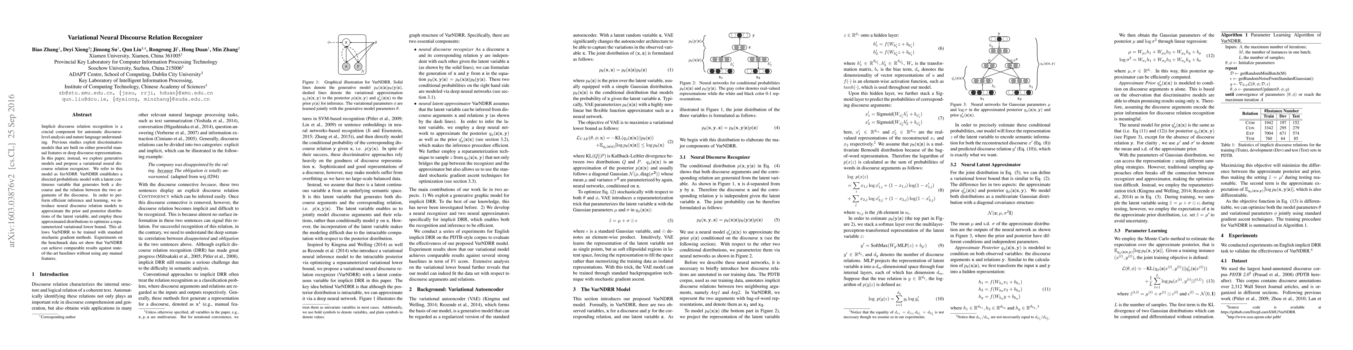 This paper proposes a variational neural discourse relation recognizer (VarNDRR) to recognize implicit discourse relations using generative models. VarNDRR employs a directed probabilistic model with a latent variable to generate discourse and relations, optimizing a variational lower bound for efficient inference and learning, achieving competitive results without manual features.