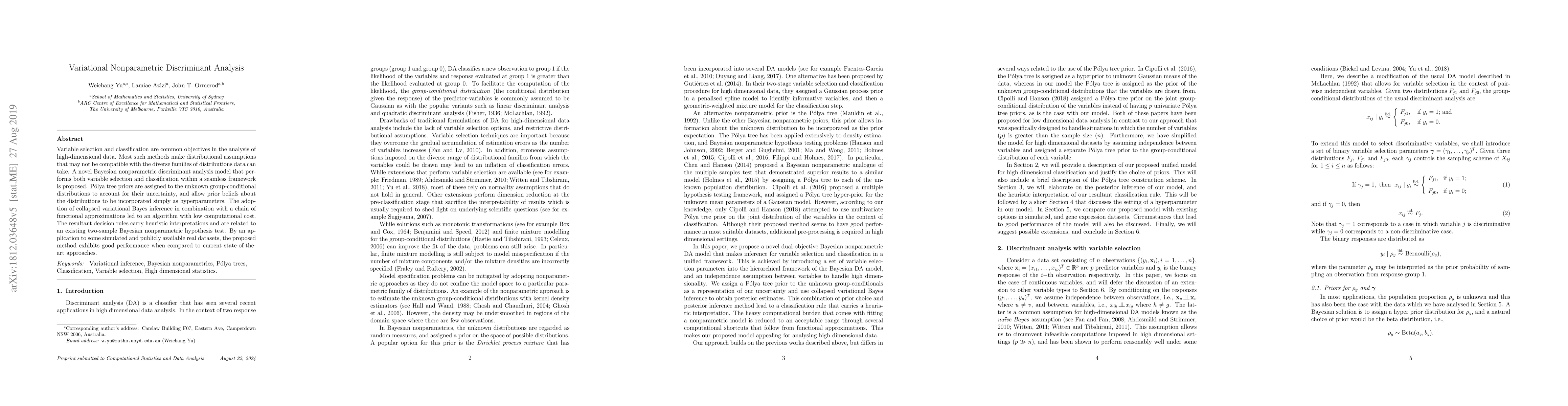 This paper proposes a novel Bayesian nonparametric discriminant analysis model for variable selection and classification in high-dimensional data, using Pólya tree priors and collapsed variational Bayes inference to achieve low computational cost and good performance. The method is shown to outperform current state-of-the-art approaches on both simulated and real datasets.