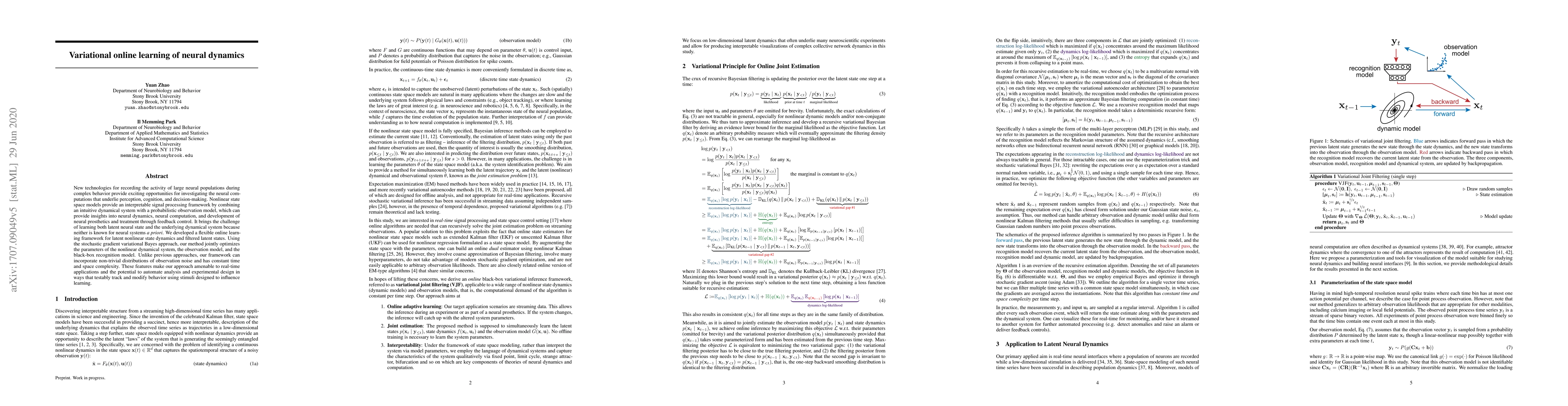 This paper introduces a variational online learning framework for modeling latent nonlinear neural dynamics and filtered states, optimizing parameters of the dynamical system, observation model, and recognition model using stochastic gradient variational Bayes. The method accommodates non-trivial observation noise distributions and maintains constant time and space complexity, enabling real-time applications and automated analysis for behavior modification.