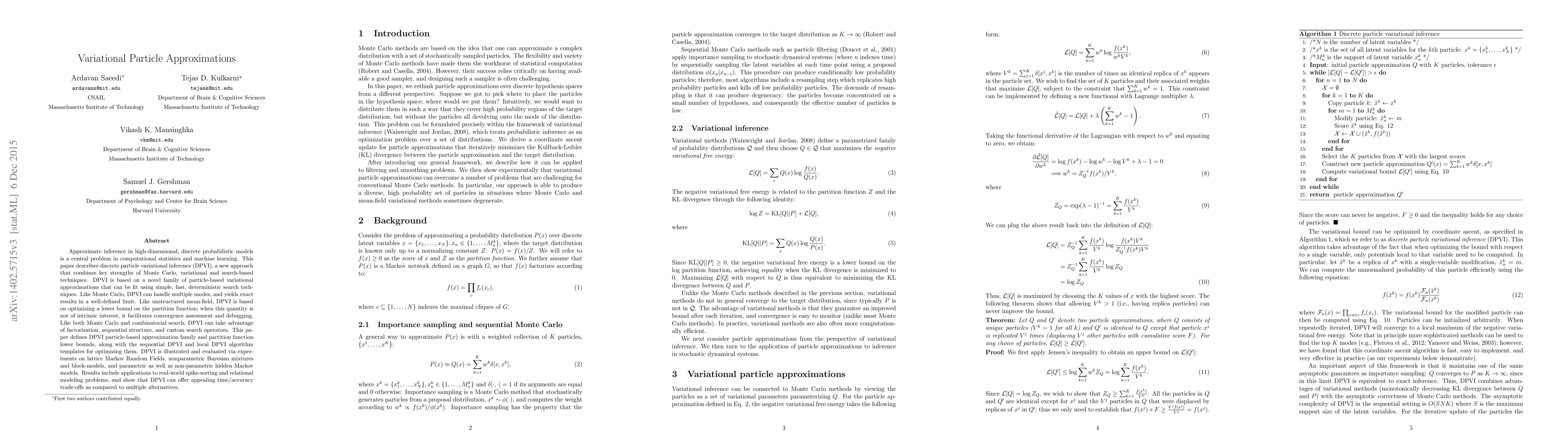 This paper introduces discrete particle variational inference (DPVI), a novel approach combining Monte Carlo, variational, and search-based techniques for approximate inference in high-dimensional, discrete probabilistic models. DPVI leverages particle-based approximations optimized via deterministic search, offering benefits like handling multiple modes, facilitating convergence assessment, and exploiting factorization and sequential structures.
