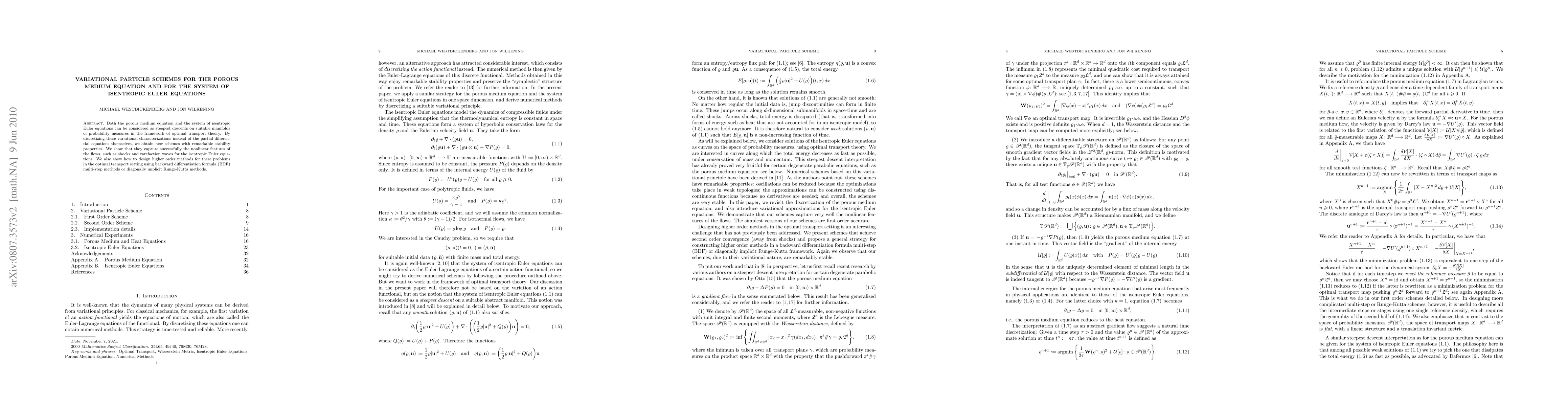 Both the porous medium equation and the system of isentropic Euler equations can be considered as steepest descents on suitable manifolds of probability measures in the framework of optimal transport theory. By discretizing these variational characterizations instead of the partial differential equations themselves, we obtain new schemes with remarkable stability properties. We show that they capture successfully the nonlinear features of the flows, such as shocks and rarefaction waves for the isentropic Euler equations. We also show how to design higher order methods for these problems in the optimal transport setting using backward differentiation formula (BDF) multi-step methods or diagonally implicit Runge-Kutta methods.