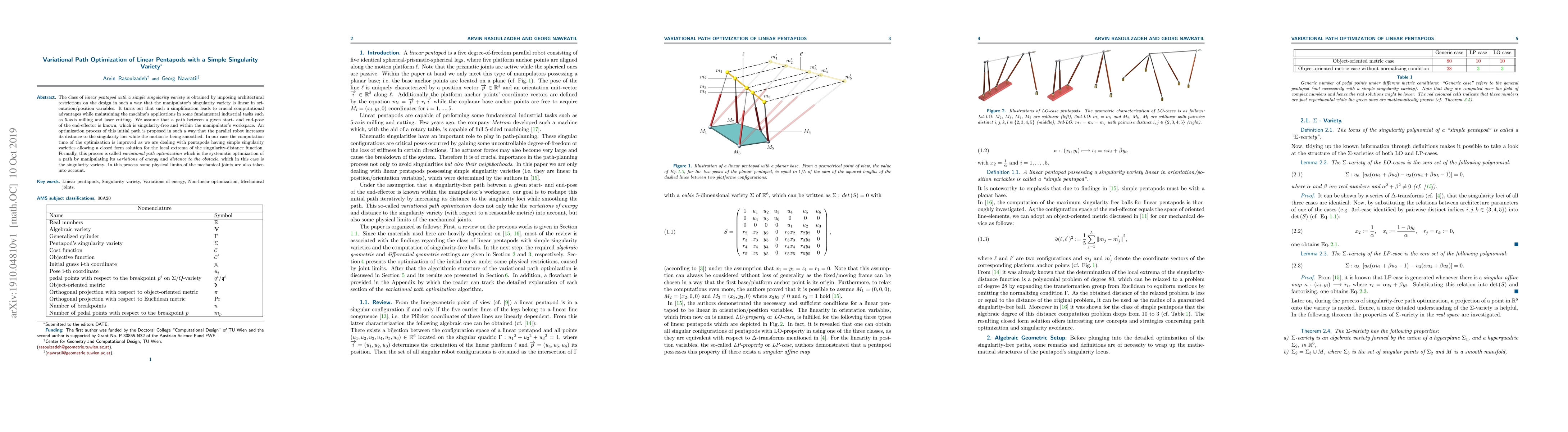 The class of linear pentapods with a simple singularity variety is obtained by imposing architectural restrictions on the design in such a way that the manipulators singularity variety is linear in orientation position variables. It turns out that such simplification leads to crucial computational advantages while maintaining the machines applications in some fundamental industrial tasks such as five axis milling and laser cutting. We assume that a path between a given start and end pose of the end effector is known which is singularity free and within the manipulators workspace. An optimization process of the initial path is proposed in such a way that the parallel robot increases its distance to the singularity loci while the motion is being smoothed. In our case the computation time of the optimization is improved as we are dealing with pentapods having simple singularity varieties allowing a closed form solution for the local exterma of the singularity distance function. Formally this process is called variational path optimization which is the systematic optimization of a path by manipulating its variations of energy and distance to the obstacle which in this case is the singularity variety. In this process some physical limits of the mechanical joints are also taken into account.