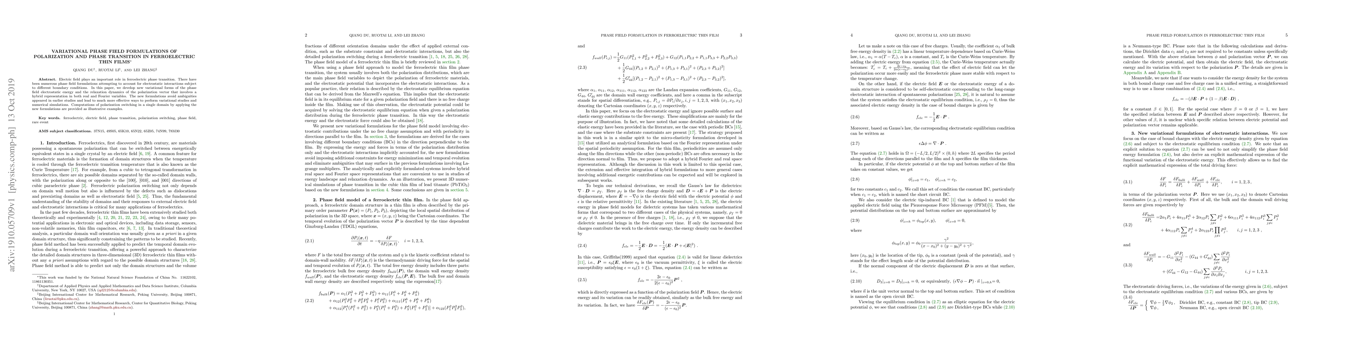 This paper introduces new variational phase field formulations for ferroelectric thin films, focusing on polarization and phase transitions under electric fields. The new hybrid representation in both real and Fourier variables enhances computational efficiency and avoids ambiguities in earlier studies, demonstrated through effective polarization switching simulations.