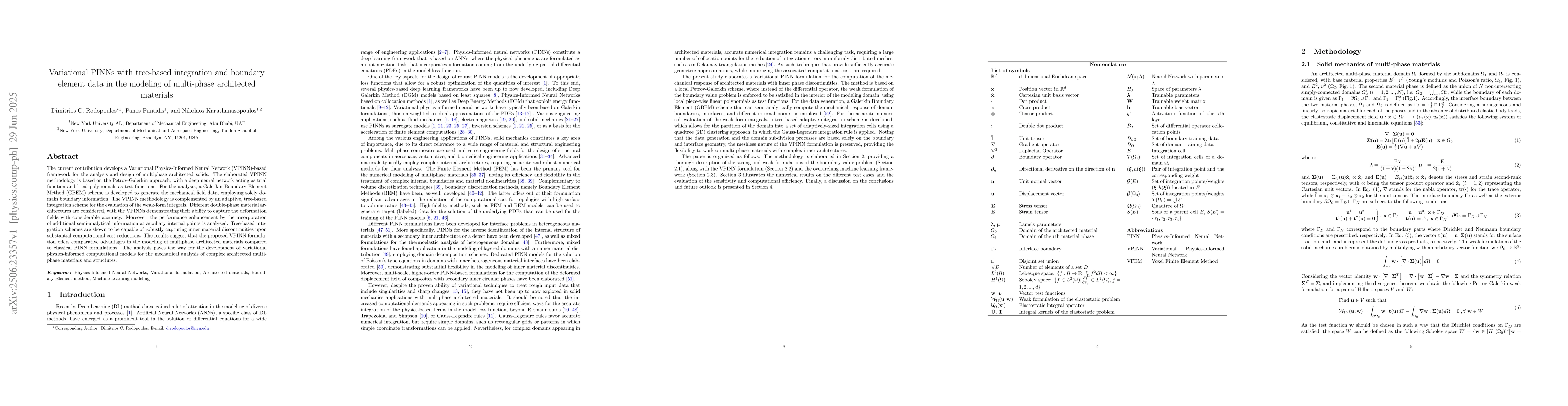 The current contribution develops a Variational Physics-Informed Neural Network (VPINN)-based framework for the analysis and design of multiphase architected solids. The elaborated VPINN methodology is based on the Petrov-Galerkin approach, with a deep neural network acting as trial function and local polynomials as test functions. For the analysis, a Galerkin Boundary Element Method (GBEM) scheme is developed to generate the mechanical field data, employing solely domain boundary information. The VPINN methodology is complemented by an adaptive, tree-based integration scheme for the evaluation of the weak-form integrals. Different double-phase material architectures are considered, with the VPINNs demonstrating their ability to capture the deformation fields with considerable accuracy. Moreover, the performance enhancement by the incorporation of additional semi-analytical information at auxiliary internal points is analyzed. Tree-based integration schemes are shown to be capable of robustly capturing inner material discontinuities upon substantial computational cost reductions. The results suggest that the proposed VPINN formulation offers comparative advantages in the modeling of multiphase architected materials compared to classical PINN formulations. The analysis paves the way for the development of variational physics-informed computational models for the mechanical analysis of complex architected multiphase materials and structures.