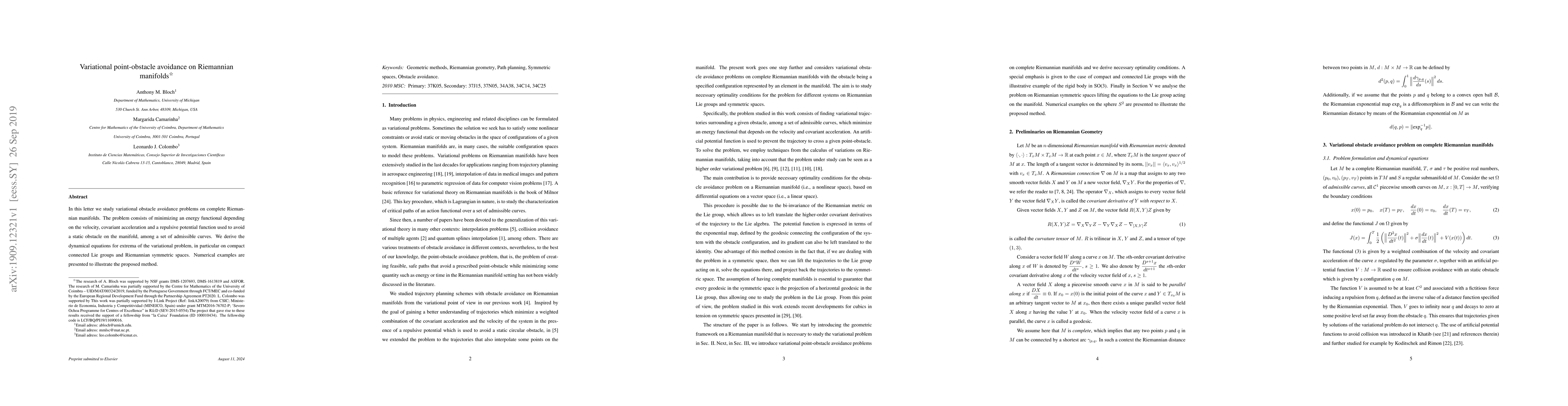 This paper explores variational obstacle avoidance on Riemannian manifolds by minimizing an energy functional involving velocity, acceleration, and a repulsive potential. It derives the dynamical equations for optimal curves on compact Lie groups and symmetric spaces, with numerical examples demonstrating the method.