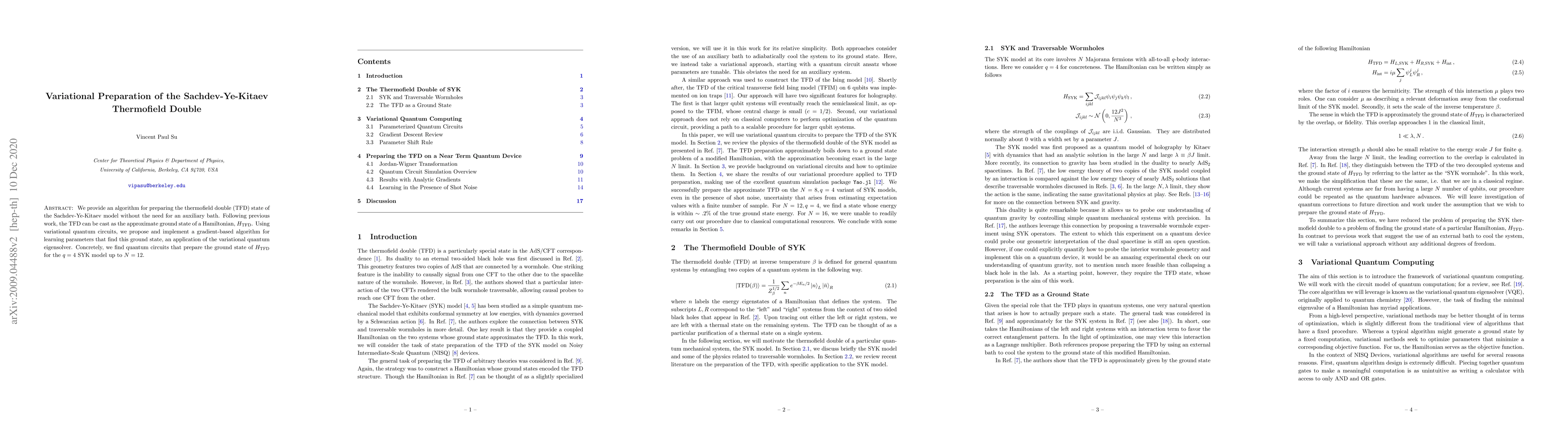 This paper presents a variational quantum algorithm for preparing the thermofield double state of the Sachdev-Ye-Kitaev model without an auxiliary bath. The authors use variational quantum circuits to find the ground state of the Hamiltonian $H_{\text{TFD}}$, successfully implementing the method for the $q=4$ SYK model up to $N=12$.
