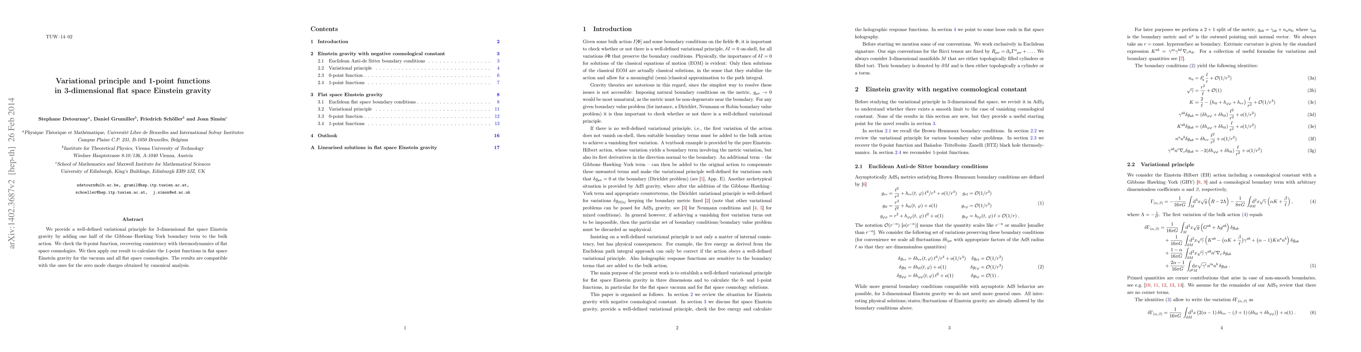 This paper establishes a variational principle for 3-dimensional flat space Einstein gravity by incorporating the Gibbons-Hawking-York boundary term, and it calculates 1-point functions, confirming consistency with thermodynamic properties and canonical analysis results.