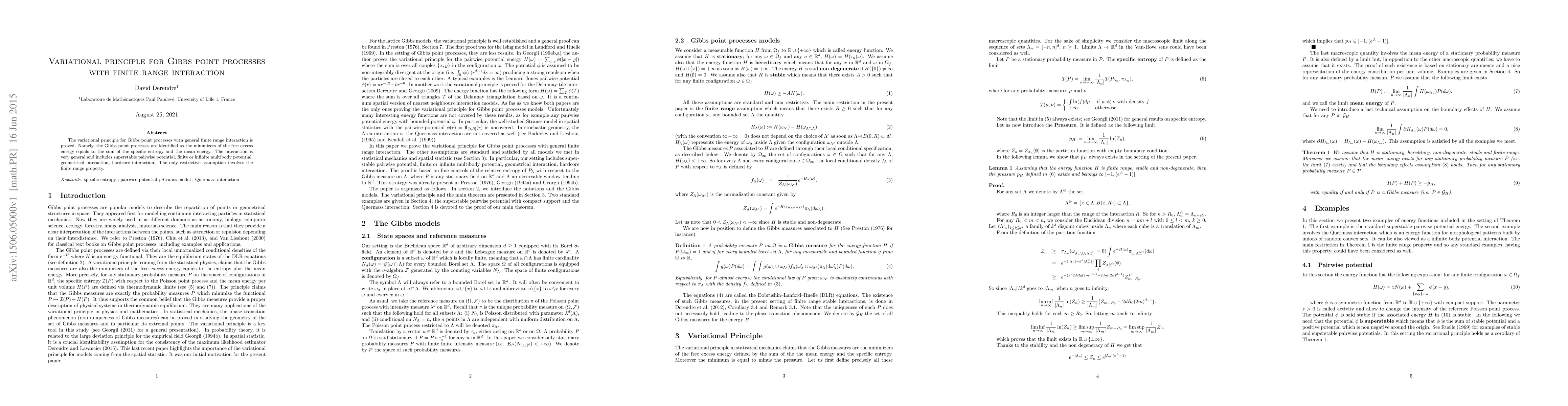 The paper proves the variational principle for Gibbs point processes with finite range interactions, showing they minimize the free excess energy. This principle encompasses a wide range of potential interactions including superstable pairwise, multibody, geometrical, and hardcore interactions.