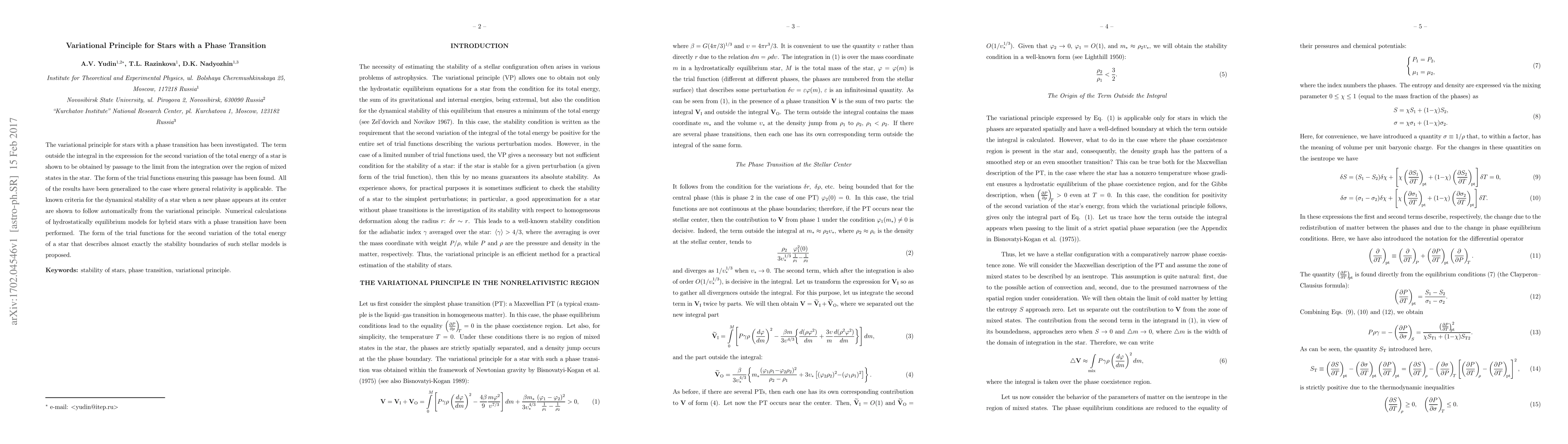The variational principle for stars with a phase transition has been investigated. The term outside the integral in the expression for the second variation of the total energy of a star is shown to be obtained by passage to the limit from the integration over the region of mixed states in the star. The form of the trial functions ensuring this passage has been found. All of the results have been generalized to the case where general relativity is applicable. The known criteria for the dynamical stability of a star when a new phase appears at its center are shown to follow automatically from the variational principle. Numerical calculations of hydrostatically equilibrium models for hybrid stars with a phase transition have been performed. The form of the trial functions for the second variation of the total energy of a star that describes almost exactly the stability boundaries of such stellar models is proposed.