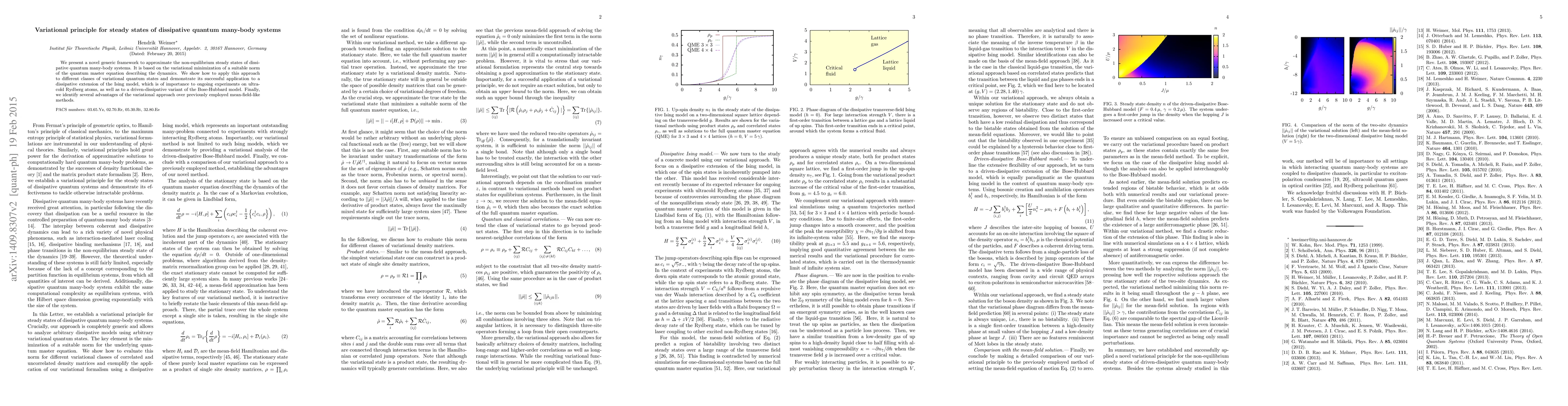 This paper introduces a variational principle to approximate non-equilibrium steady states in dissipative quantum many-body systems, applying it to a dissipative Ising model relevant to ultracold Rydberg atoms experiments, and highlights its benefits over traditional mean-field methods.