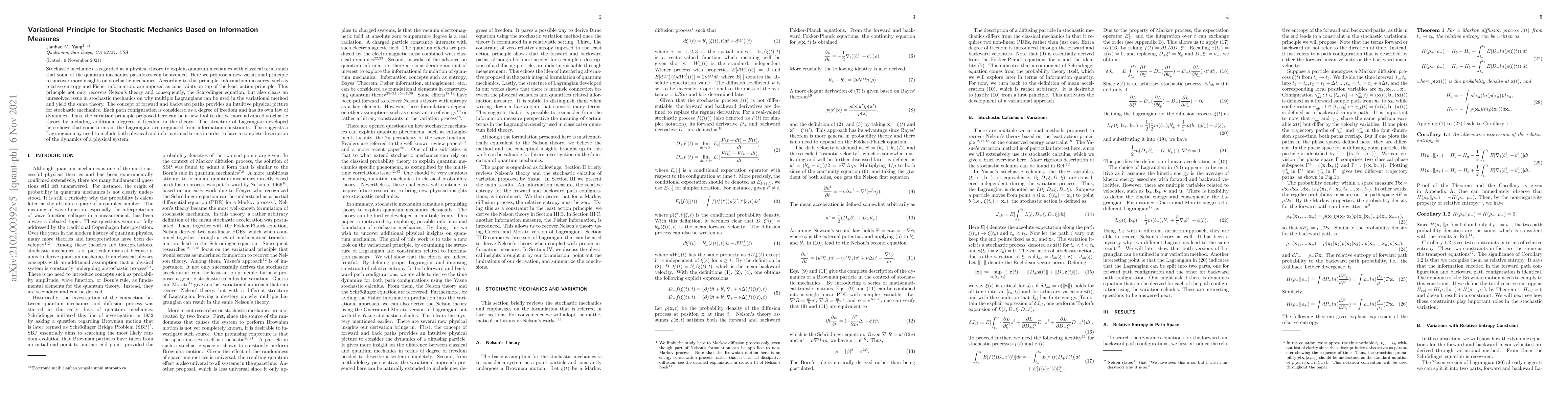 This paper proposes a new variational principle for stochastic mechanics that incorporates information measures, resolving an issue regarding the use of multiple Lagrangians. The principle integrates relative entropy and Fisher information, leading to a Lagrangian that includes both physical and informational terms, providing a deeper understanding of stochastic mechanics.