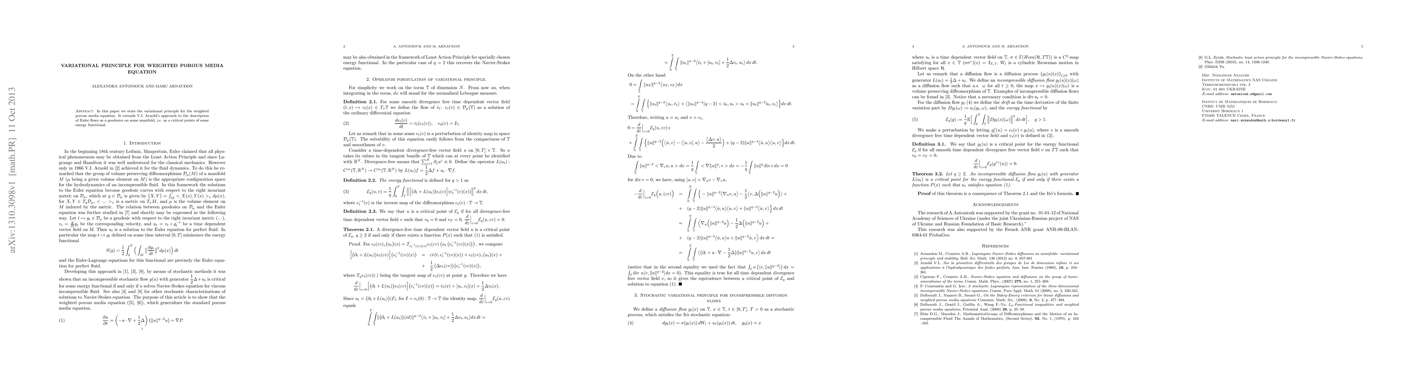 The paper establishes a variational principle for the weighted porous media equation, extending V.I. Arnold's approach for Euler flows as geodesics on a manifold, described by a critical point of an energy functional.