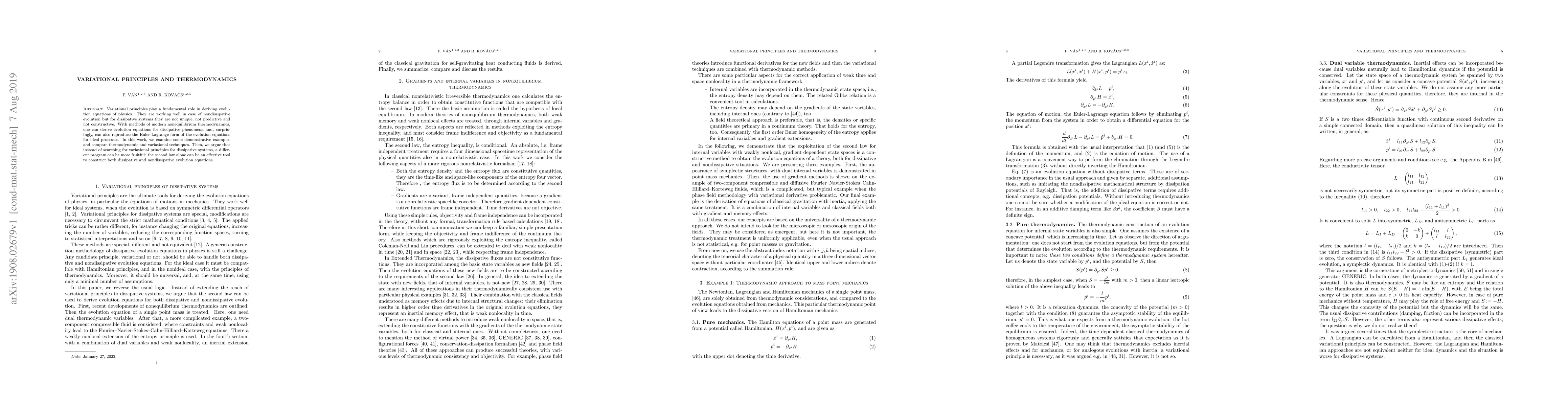 Variational principles play a fundamental role in deriving evolution equations of physics. They are working well in case of nondissipative evolution but for dissipative systems they are not unique, not predictive and not constructive. With methods of modern nonequilibrium thermodynamics, one can derive evolution equations for dissipative phenomena and, surprisingly, can also reproduce the Euler-Lagrange form of the evolution equations for ideal processes. In this work, we examine some demonstrative examples and compare thermodynamic and variational techniques. Then, we argue that instead of searching for variational principles for dissipative systems, a different program can be more fruitful: the second law alone can be an effective tool to construct both dissipative and nondissipative evolution equations.